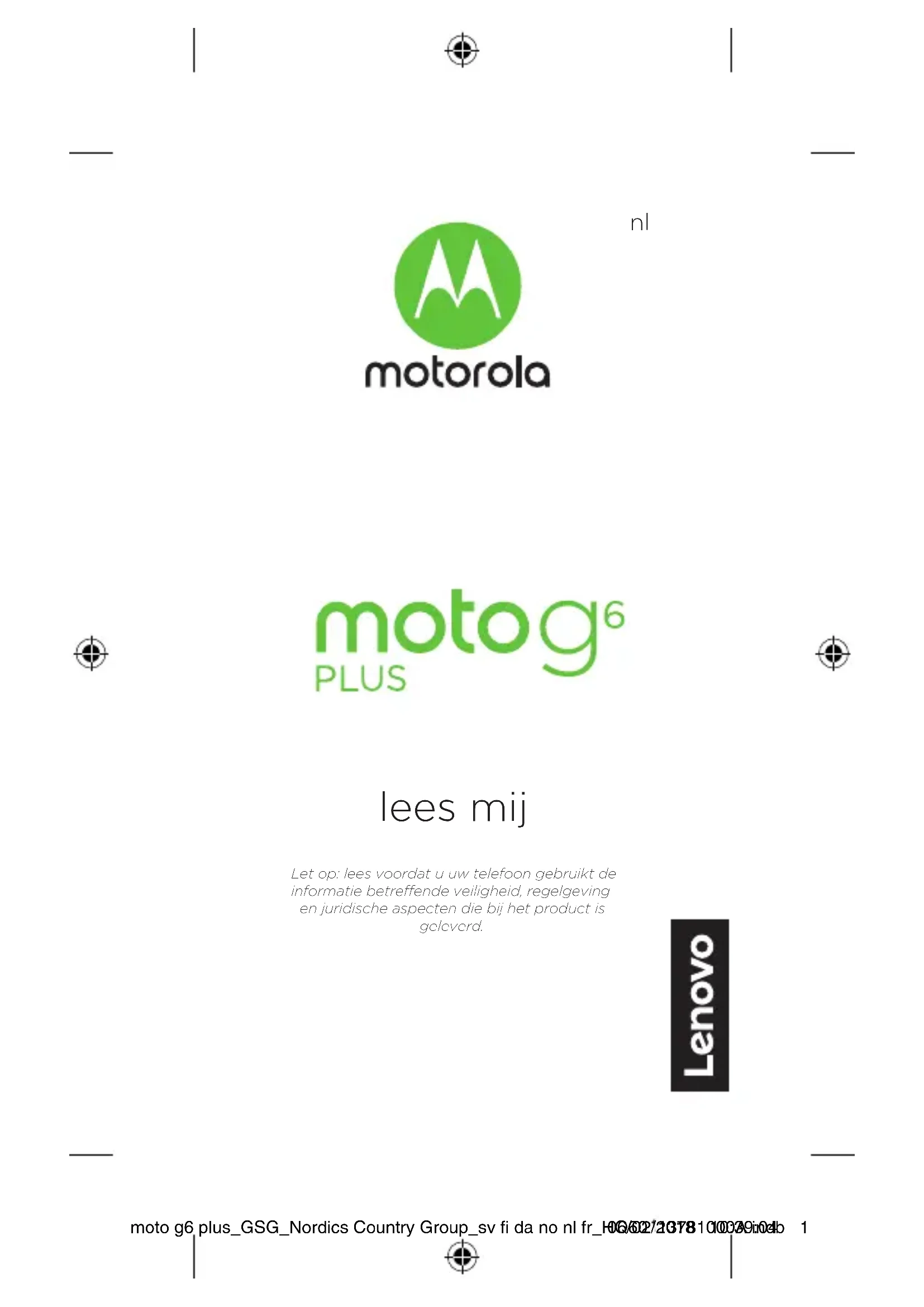 - Doe mee: vind ons op YouTube™, Facebook™ en Twitter. Waar is mijn juridische, veiligheids- en regelgevende informatie? Om u beter toegang tot deze belangrijke informatie te geven, hebben we het materiaal via het instellingenmenu op de telefoon en op internet toegankelijk gemaakt. Controleer dit materiaal voordat u uw apparaat gebruikt. Om het materiaal op een verbonden telefoon te openen, gaat u naar Instellingen > Systeem> Juridische informatie, en selecteert u een onderwerp. Om het materiaal op het internet te openen, gaat u naar www.motorola.com/device-legal. moto g6 plus_GSG_Nordics Country Group_sv fi da no nl fr_HQ60113781000A.indb 606/02/2018 10:39:067 Accuveiligheid Lees eerst de meegeleverde belangrijke informatie over veiligheid en juridische zaken voordat u uw mobiele apparaat voor de eerste keer in elkaar zet, oplaadt of gebruikt. Probeer uw mobiele apparaat opnieuw op te starten als het niet meer reageert. Houd de aan/uit-knop ingedrukt totdat het scherm wordt uitgeschakeld. Hierna wordt uw apparaat opnieuw opgestart. Voor uw veiligheid mag de accu van uw mobiele apparaat uitsluitend worden verwijderd door een servicecentrum of onafhankelijke bevoegde deskundige dat/die door Motorola is goedgekeurd. Verwijder of vervang de accu niet zelf. De accu kan dan beschadigd raken, er kan brand ontstaan of u kunt letsel oplopen. Plet of buig uw mobiele apparaat niet en stel het niet bloot aan hitte of vocht. Dit kan de accu beschadigen en brandwonden of letsel veroorzaken. Probeer uw mobiele apparaat niet te drogen in een magnetron, oven of met een föhn. Waarschuwing voor een te hoog volume Luister niet langere tijd naar geluid bij een hoog volume om mogelijke gehoorschade te voorkomen. Verwijderen en recyclen Draag uw steentje bij. Gooi uw mobiele apparaten of elektrische accessoires (zoals acculaders, headsets en accu's) nooit weg bij het huisvuil. Verpakkingen en handleidingen moet u weggooien volgens de regels voor inzamelen en recyclen van de lokale of regionale overheid. Meer informatie over door Motorola goedgekeurde nationale recyclingprogramma's en over Motorola's eigen activiteiten op dit gebied vindt u op: www.motorola.com/recycling. Gebruik Deze telefoon biedt ondersteuning voor gegevensintensieve apps en services, dus zorg dat uw gegevensabonnement aan uw eisen voldoet. Neem voor meer informatie contact op met uw serviceprovider. Bepaalde apps en functies zijn mogelijk niet in alle landen beschikbaar. Wettelijke informatie Om het wettelijke id (zoals FCC ID) voor dit apparaat op de telefoon weer te geven, gaat u naar Instellingen > Systeem > Wettelijke informatie of gaat u naar www.motorola.com/device-legal. Garantie Dit product valt onder de Beperkte garantie van Motorola. Om deze garantie op uw telefoon weer te geven, gaat u naar Instellingen> Systeem > Juridische informatie > Garantie, of gaat u naar moto g6 plus_GSG_Nordics Country Group_sv fi da no nl fr_HQ60113781000A.indb 706/02/2018 10:39:068 www.motorola.com/device-legal. U kunt een kopie van deze garantie aanvragen door contact op te nemen met Motorola op: Motorola Mobility LLC, Attention Customer Service--Warranty Request, 222 West Merchandise Mart Plaza, Suite 1800, Chicago, IL 60654, VS. Arbitrage en onttrekking Tenzij bij wet verboden, zullen eventuele geschillen of vorderingen die voortkomen uit of verband houden met een product van Motorola worden opgelost via bindende arbitrage, in plaats van voor de rechtbank, tenzij u arbitrage afwijst. Om arbitrage af te wijzen, stuurt u binnen 30 dagen na aankoop een schriftelijke afwijzing, waarin u het adres, telefoonnummer en het apparaat- en serienummer van het apparaat vermeldt, naar: Motorola Mobility LLC, 222 West Merchandise Mart Plaza, Suite 1800, t.a.v. Arbitration Provision Opt-Out, Chicago, IL 60654, VS, of arbitrat@motorola.com, en laat u Motorola weten dat u deze arbitragebepaling afwijst. Voor meer informatie over deze arbitragebepaling gaat u op uw telefoon naar Instellingen > Systeem> Juridische informatie > Arbitrage en onttrekking, of gaat u naar www.motorola.com/device-legal. Juridische disclaimers Sommige functies, services en apps zijn afhankelijk van het netwerk en zijn mogelijk niet in alle gebieden beschikbaar. Aanvullende voorwaarden en/of kosten zijn mogelijk van toepassing. Neem voor meer informatie contact op met uw serviceprovider. Alle functies, functionaliteit en andere productspecificaties, evenals de informatie in deze handleiding, zijn gebaseerd op de laatst beschikbare informatie en worden op het moment dat de handleiding is gedrukt, beschouwd als nauwkeurig. Motorola behoudt zich het recht voor om informatie of specificaties te corrigeren of wijzigen zonder voorafgaande kennisgeving of verplichtingen. Copyright en handelsmerken MOTOROLA, het logo met gestileerde M, MOTO en de MOTO- merkreeks zijn handelsmerken of geregistreerde handelsmerken van Motorola Trademark Holdings, LLC. LENOVO is een handelsmerk van Lenovo. Google, Android, Google Play en overige merken zijn handelsmerken van Google Inc. microSD Logo is een handelsmerk van SD-3C, LLC. Gefabriceerd onder licentie van Dolby Laboratories. Dolby, Dolby Audio en het dubbele D-symbool zijn handelsmerken van Dolby Laboratories. Alle overige product- en servicenamen zijn eigendom van de respectieve eigenaren. © 2018 Motorola Mobility LLC. Alle rechten voorbehouden. Product-id: moto g