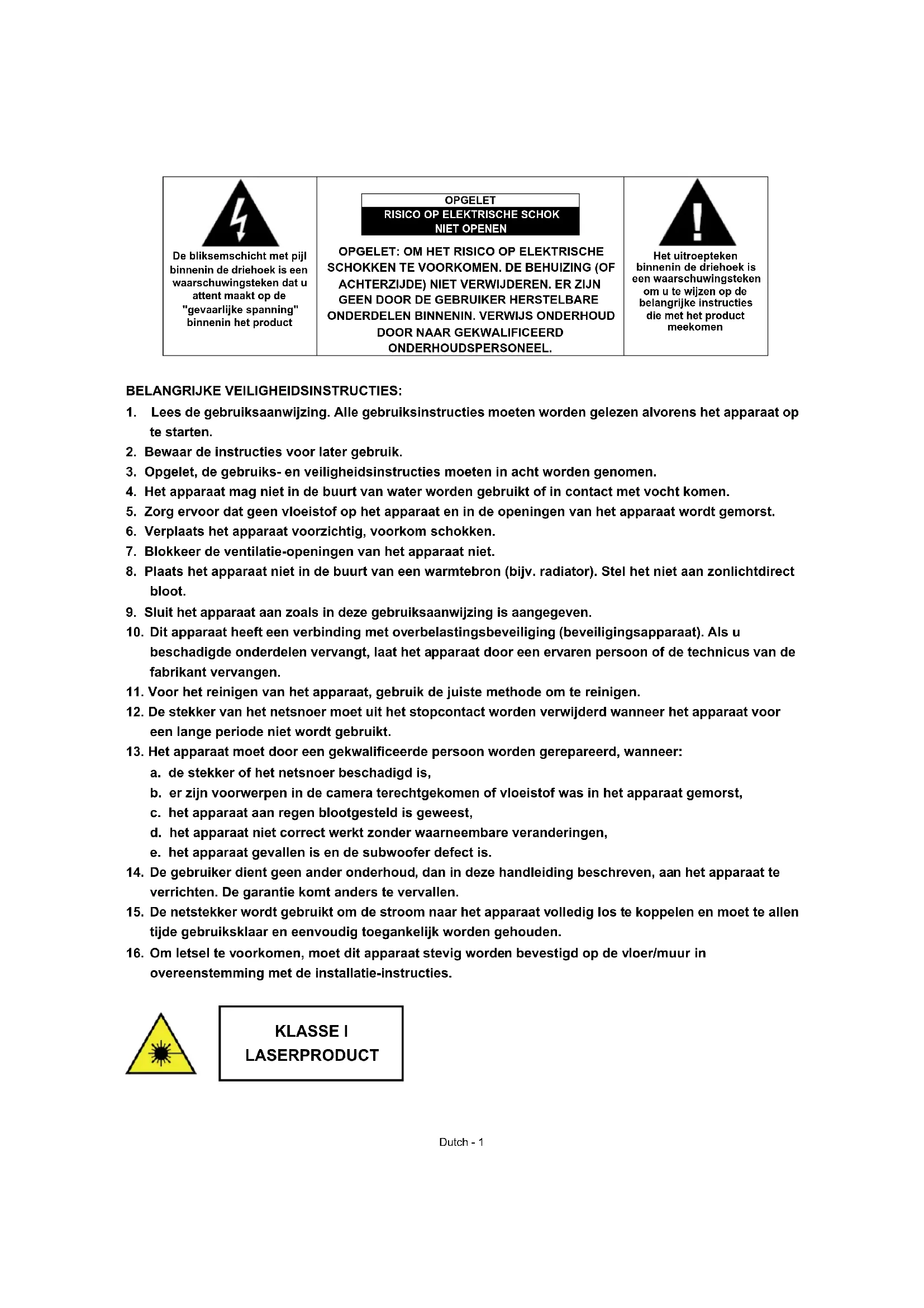 16. Om letsel te voorkomen, moet dit apparaat stevig worden bevestigd op de vloer/muur in