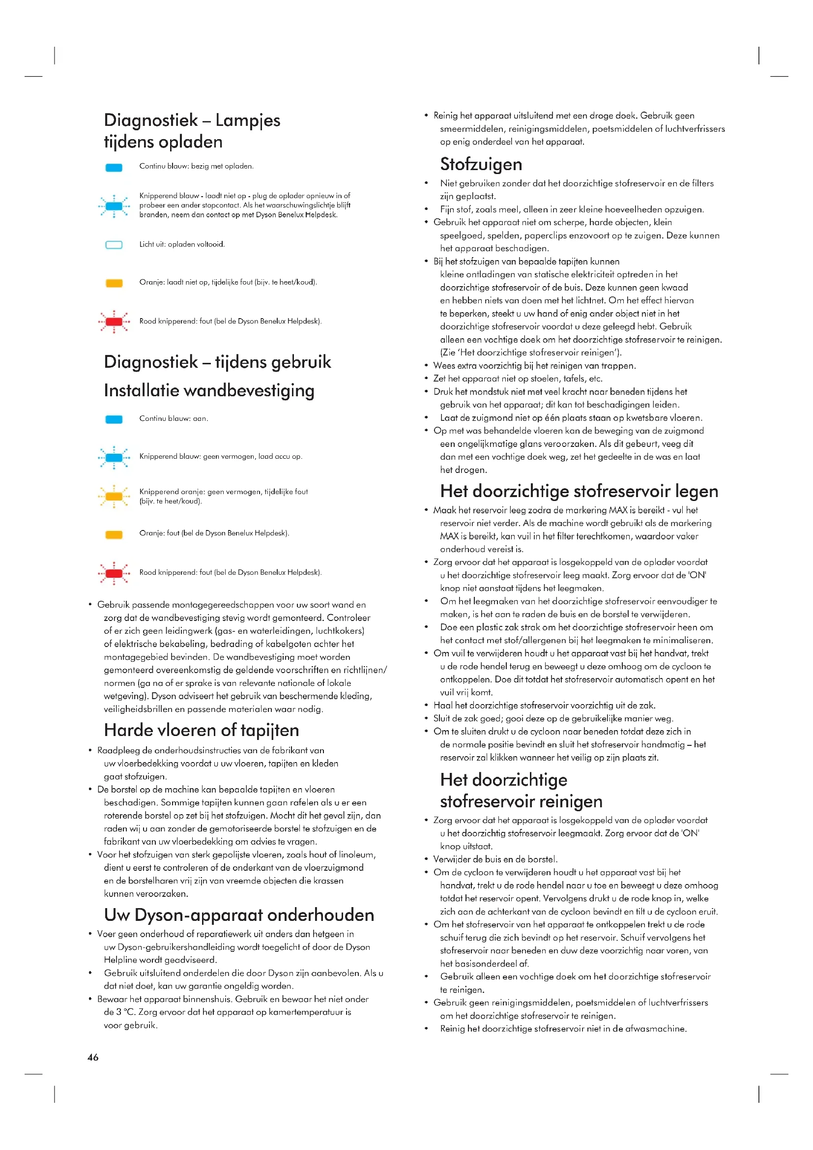- De borstels van dit product zijn gemaakt van koolstofvezels. Wees voorzichtig wanneer u in contact komt met de koolstofvezels, aangezien deze lichte huidirritatie kunnen veroorzaken. Was uw handen na aanraking met de borstels.46 Continu blauw: bezig met opladen. Knipperend blauw - laadt niet op - plug de oplader opnieuw in of probeer een ander stopcontact. Als het waarschuwingslichtje blijft branden, neem dan contact op met Dyson Benelux Helpdesk. Licht uit: opladen voltooid. Oranje: laadt niet op, tijdelijke fout (bijv. te heet/koud). Rood knipperend: fout (bel de Dyson Benelux Helpdesk). Continu blauw: aan. Knipperend blauw: geen vermogen, laad accu op. Knipperend oranje: geen vermogen, tijdelijke fout (bijv. te heet/koud). Oranje: fout (bel de Dyson Benelux Helpdesk). Rood knipperend: fout (bel de Dyson Benelux Helpdesk). Diagnostiek – Lampjes tijdens opladen Diagnostiek – tijdens gebruik Installatie wandbevestiging