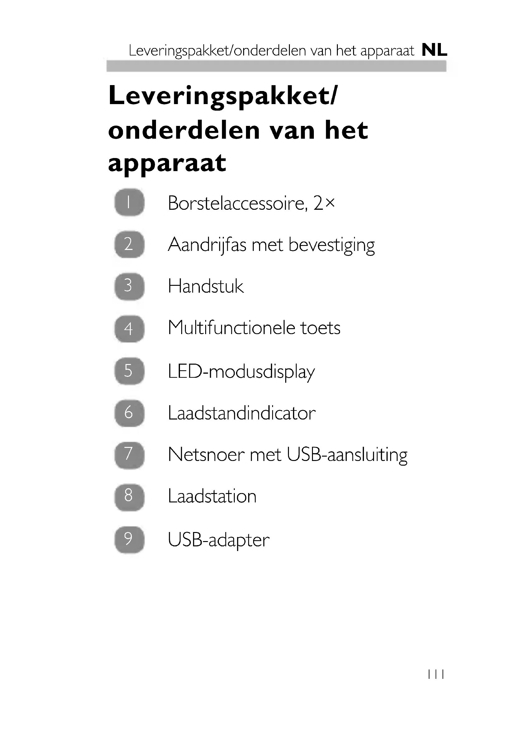 Leveringspakket/onderdelen van hetapparaat