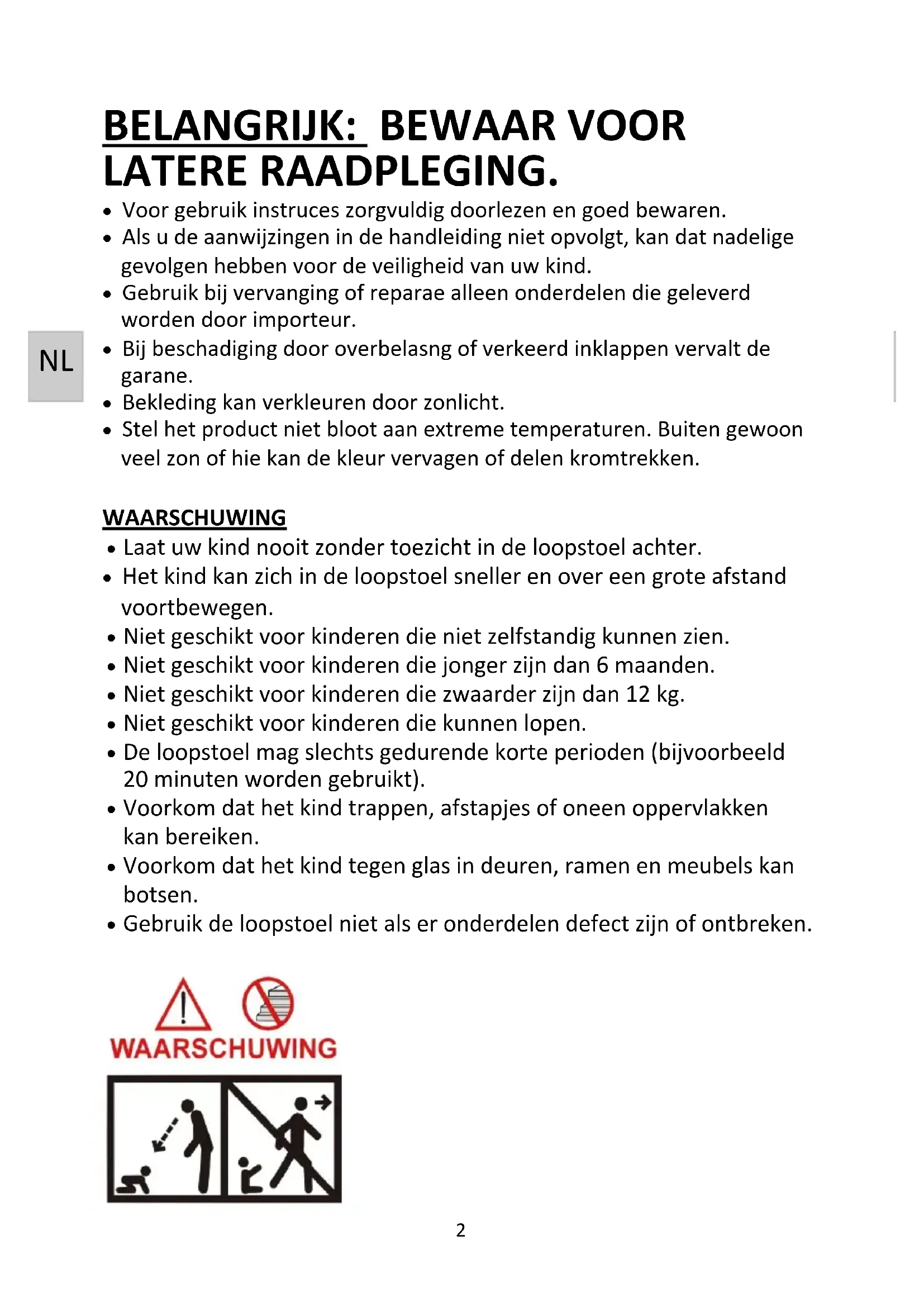 WAARSCHUWING: Zorg ervoor dat bij het openen, inklappen en afstellen van de loopstoel uw kind zich op een veilige afstand bevindt.