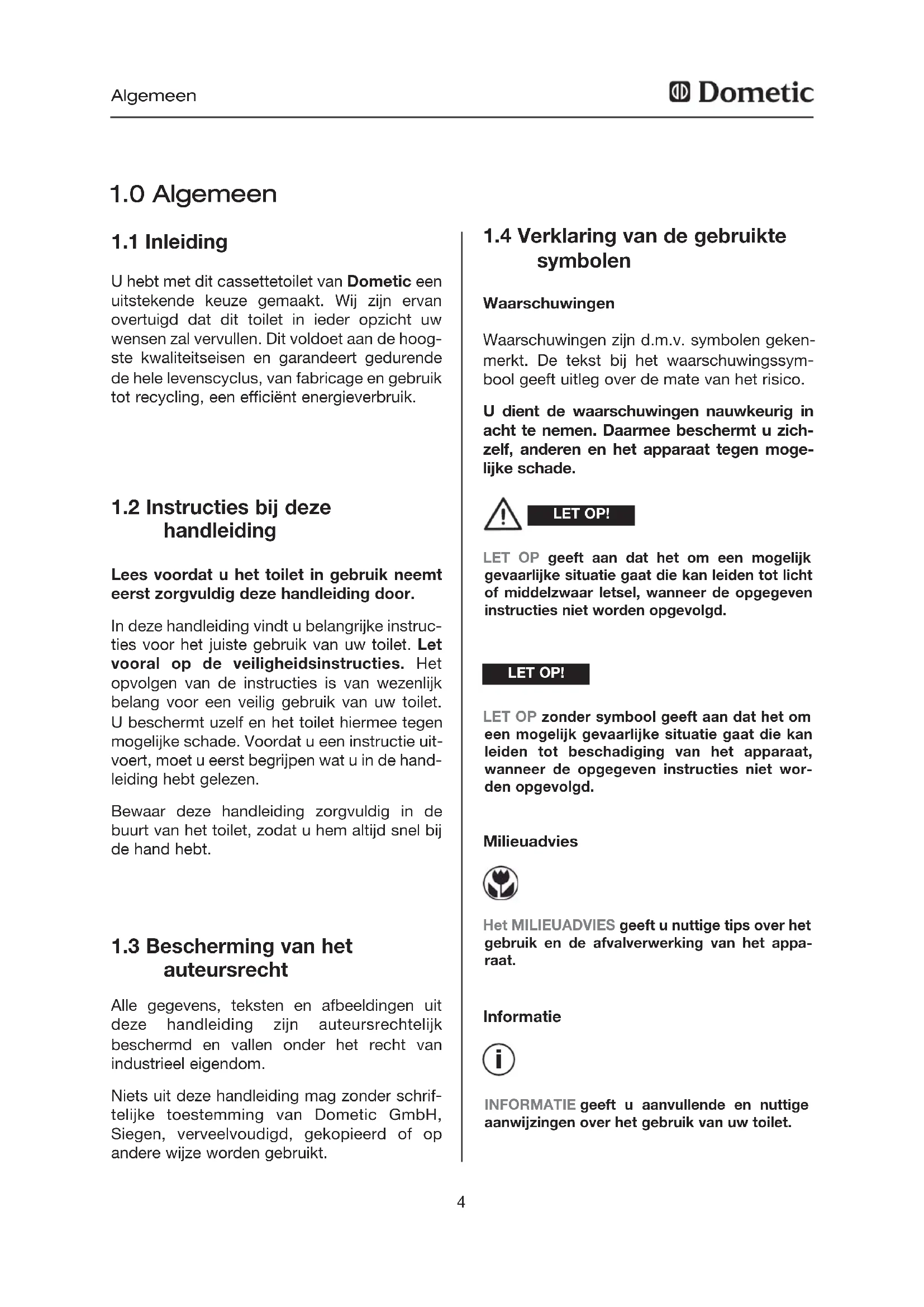 U hebt met dit cassettetoilet van Dometic een uitstekende keuze gemaakt. Wij zijn ervan overtuigd dat dit toilet in ieder opzicht uw wensen zal vervullen. Dit voldoet aan de hoog- ste kwaliteitseisen en garandeert gedurende de hele levenscyclus, van fabricage en gebruik tot recycling, een efficiënt energieverbruik.
