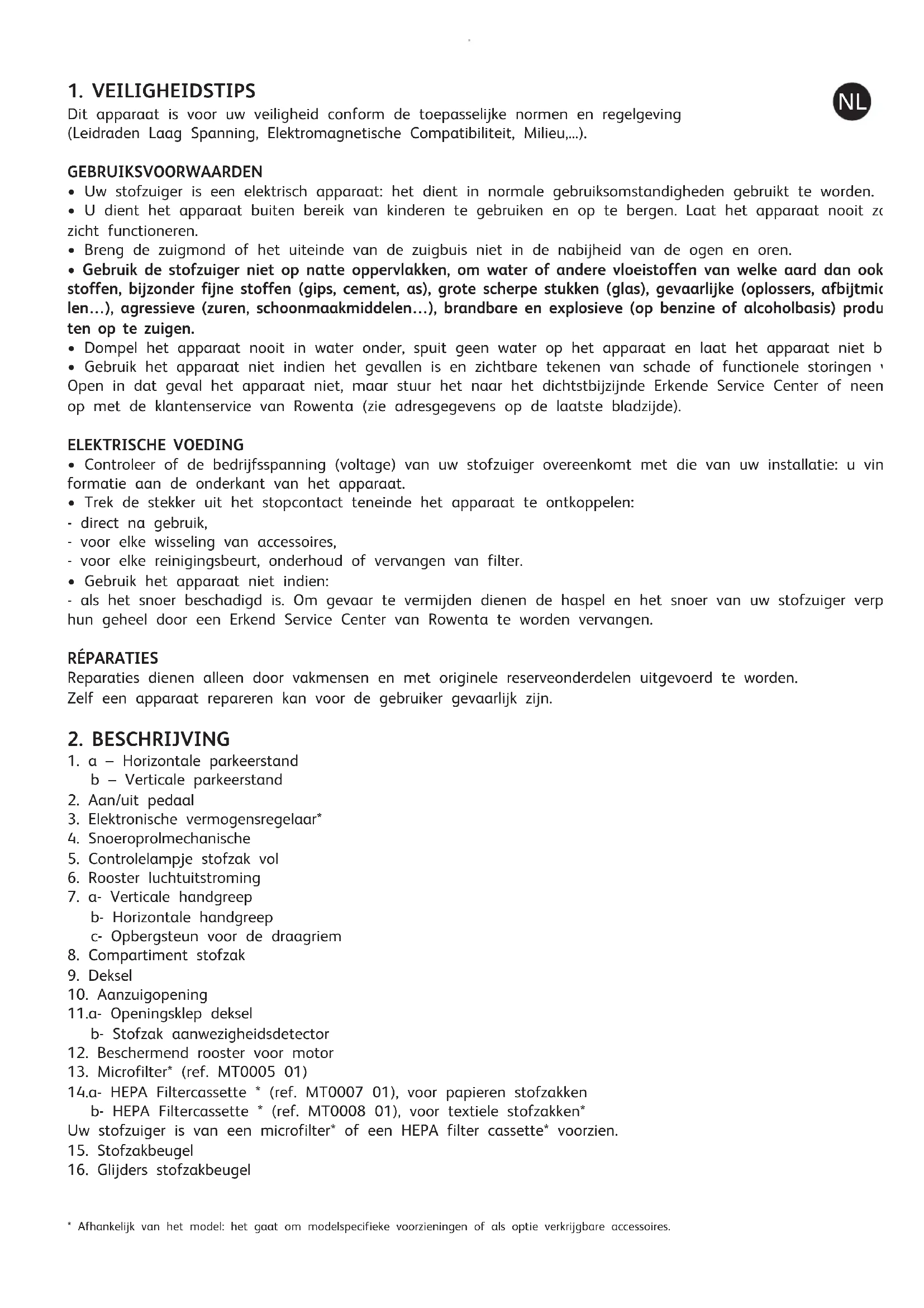 14.a- HEPA Filtercassette * (ref. MT0007 01), voor papieren stofzakken b- HEPA Filtercassette * (ref. MT0008 01), voor textiele stofzakken* Uw stofzuiger is van een microfilter* of een HEPA filter cassette* voorzien.