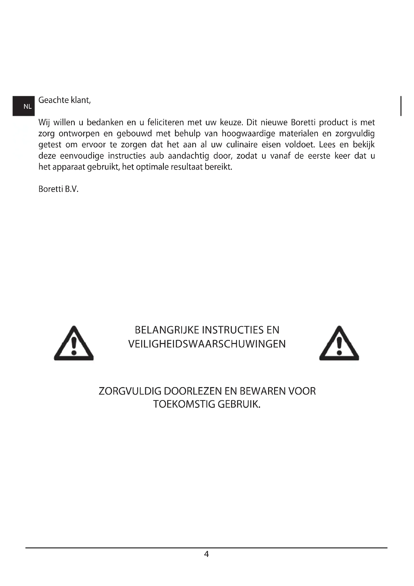 Geachte klant, Wij willen u bedanken en u feliciteren met uw keuze. Dit nieuwe Boretti product is met zorg ontworpen en gebouwd met behulp van hoogwaardige materialen en zorgvuldig getest om ervoor te zorgen dat het aan al uw culinaire eisen voldoet. Lees en bekijk deze eenvoudige instructies aub aandachtig door, zodat u vanaf de eerste keer dat u het apparaat gebruikt, het optimale resultaat bereikt. Boretti B.V.