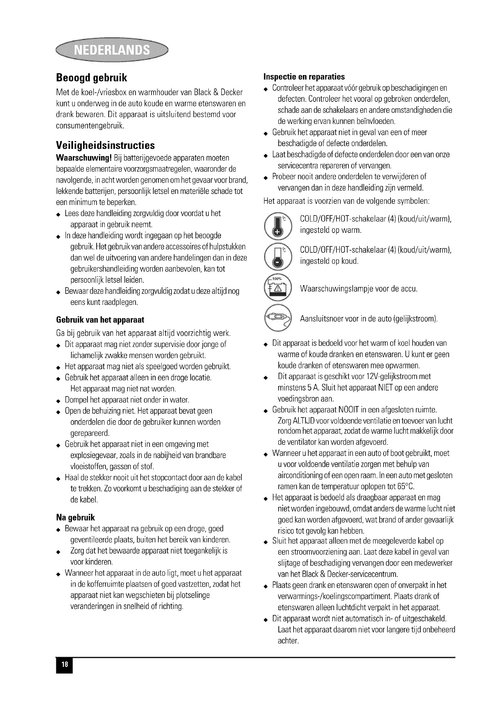 Met de koel-/vriesbox en warmhouder van Black & Decker kunt u onderweg in de auto koude en warme etenswaren en drank bewaren. Dit apparaat is uitsluitend bestemd voor consumentengebruik.