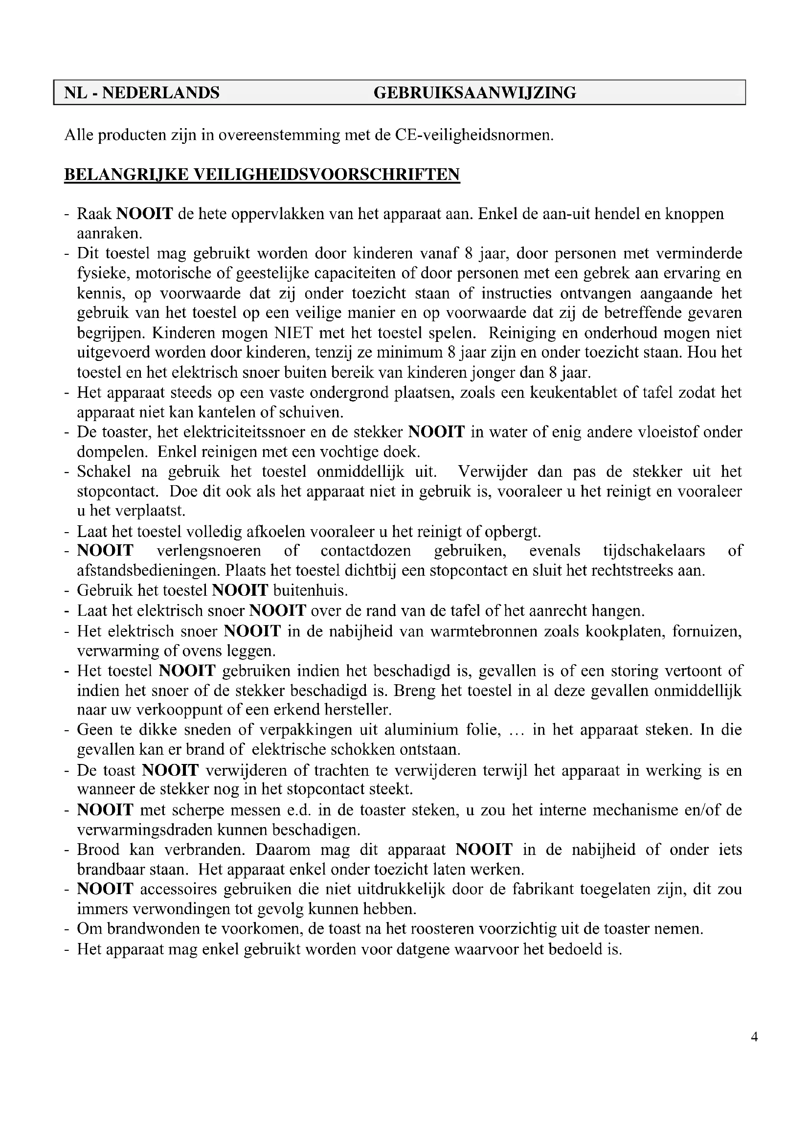 Proficiat! U kocht zonet een design toaster die uw ontbijt voortaan tot een waar feest zal make. Lees deze gebruiksaanwijzing evenals de veiligheidsvoorschriften aandachtig vooraleer u de toaster in gebruik neemt en bewaar deze zorgvuldig. Personen die deze gebruiksaanwijzing Niet gelezen hebben, mogen deze toaster nicht gebruiken.
