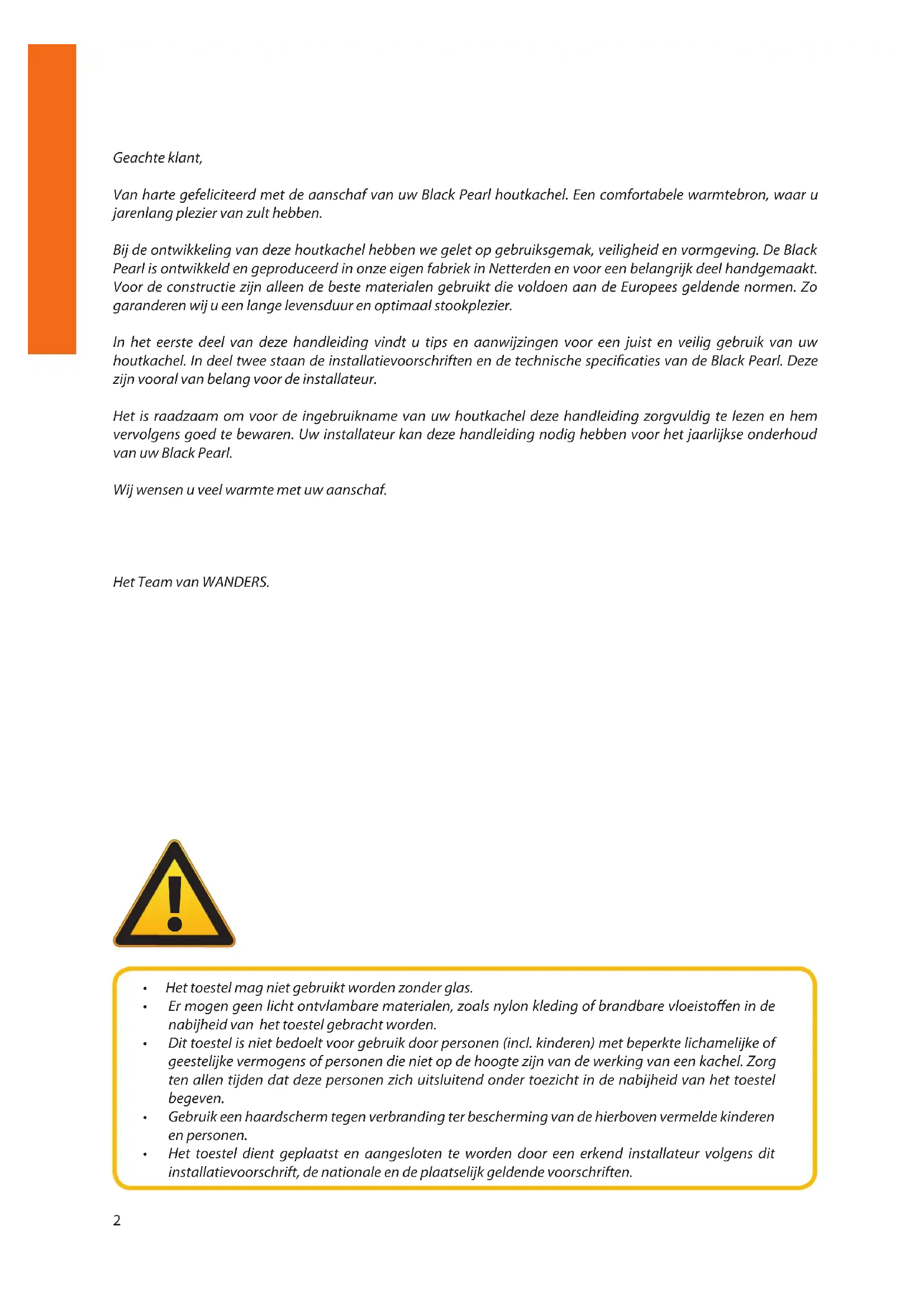 Handleiding en installatievoorschriften 2 Users guide and installation manual 16 Mode d’emploi et instructions d’installation 30 Bedienungsanleitung und Installationsvorschriften 452 Geachte klant, Van harte gefeliciteerd met de aanschaf van uw Black Pearl houtkachel. Een comfortabele warmtebron, waar u jarenlang plezier van zult hebben. Bij de ontwikkeling van deze houtkachel hebben we gelet op gebruiksgemak, veiligheid en vormgeving. De Black Pearl is ontwikkeld en geproduceerd in onze eigen fabriek in Netterden en voor een belangrijk deel handgemaakt. Voor de constructie zijn alleen de beste materialen gebruikt die voldoen aan de Europees geldende normen. Zo garanderen wij u een lange levensduur en optimaal stookplezier. In het eerste deel van deze handleiding vindt u tips en aanwijzingen voor een juist en veilig gebruik van uw houtkachel. In deel twee staan de installatievoorschriften en de technische specicaties van de Black Pearl. Deze zijn vooral van belang voor de installateur. Het is raadzaam om voor de ingebruikname van uw houtkachel deze handleiding zorgvuldig te lezen en hem vervolgens goed te bewaren. Uw installateur kan deze handleiding nodig hebben voor het jaarlijkse onderhoud van uw Black Pearl. Wij wensen u veel warmte met uw aanschaf. Het Team van WANDERS.