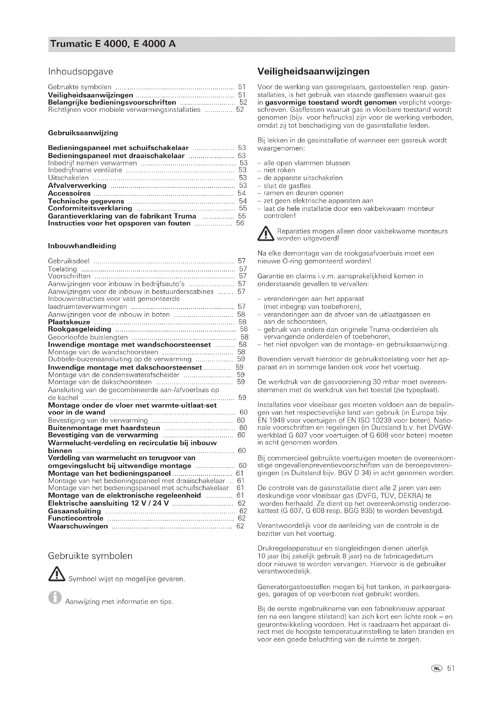 Gebruiksaanwijzing Inbedrijfname ventilatie Bedieningspaneel met schuifschakelaar Schakelaar (a) op ventilatie en schakelaar (b) op het gewenste vermogen zetten. Bedieningspaneel met draaischakelaar Draaischakelaar op het gewenste vermogen (e) zetten. Uitschakelen Schuifschakelaar (a) resp. draaischakelaar (d) in het midden zetten. Wanneer de verwarming na een verwarmingsfase wordt uitgeschakeld, kan de ventilator vanwege het gebruik van de restwarmte nog nalopen. Wanneer het apparaat gedurende langere tijd niet wordt ge- bruikt, de schoorsteenafdekkap erop plaatsen en het snelsluit- ventiel in de gastoevoerleiding en de gasfles sluiten. Groen LED „Werking” (onder draaiknop) Bij het ingeschakelde apparaat (verwarmen of ventilatie) moet de groene LED oplichten (de ventilator is in werking). Indien de LED niet oplicht, eventueel de (hoofd-)schake- laar controleren. Gebruik hiervoor de handleiding van de voertuigproducent. Bij het verwarmen, terwijl de vlam brandt, verdubbelt de lichtsterkte van de groene LED. Daarmee kan ook het scha- kelpunt van dat moment voor de ruimtetemperatuur worden vastgesteld. Zekeringen De toestelzekering alsmede de zekering van het bedienings- paneel bevinden zich op de elektronische regeleenheid op het toestel. Toestelzekering (F1): 3,15 AT – traag – (EN 60127-2-3) Zekering bedieningspaneel (F3): 1,6 AT – traag – De fijnzekering mag enkel door een bouwidentieke zekering worden vervangen. Rood LED „storing” Bij een storing licht de rode LED op. Mogelijke oorzaken zijn: geen gastoevoer, onvoldoende verbrandingslucht, sterk vervuild be luchtings rotor, defecte zekering, enz. De storing kunt u opheffen door het apparaat eerst uit en dan weer in te schakelen. Als het venster, waaraan een vensterschakelaar is gemon- teerd, wordt geopend en gesloten, komt dit overeen met een uit / aan aan het bedieningspaneel (bijv. bij storingsreset)! Knipperen duidt op een te geringe of te hoge bedrijfsspan- ning voor de verwarming (evtl. batterij opladen). In Duitsland moet bij storingen in principe het Truma ser- vicecentrum worden gewaarschuwd; in andere landen staan de bestaande servicepartners tot uw beschikking (zie Truma Serviceblad of www.truma.com). Afvalverwerking De gaskachel moet volgens de bepalingen van overheidswege van het desbetreffende land worden afgevoerd. Nationale voorschriften en wetten (in Duitsland is dit bijv. de Altfahr- zeug-Verordnung) moeten in acht worden genomen.54 Accessoires 1 Voorschakelapparaat VG 2 ten behoeve van verwarmingen voor bestuurderscabines van voertuigen voor het transport van gevaarlijke stoffen en tankwagens volgens ADR (mag niet in combinatie met een tijdschakelklok worden gebruikt). 2 Buitenschakelaar AS voor het in- resp. uitschakelen van de verwarming buiten het voertuig, bijvoorbeeld bij laadruimte-verwarmingen (leverbaar met 4 m of 10 m aansluitkabel). 3 Akoestische storingsmelder ASM geeft een akoestisch signaal bij een eventuele storing. 4 Tijdschakelklok ZUE t.b.v. het voorprogrammeren van 3 inschakeltijden binnen 7 dagen, compl. met 4 m aansluitkabel (geschikt voor 12 V en 24 V boordnet). 5 Afstandvoeler controleert de ruimtetemperatuur, onafhankelijk van de positie van het bedieningspaneel (leverbaar met 4 m of 10 m aansluitkabel). 6 Multi-contactdoos MSD voor het aansluiten van meerdere accessoires (b.v. tijdscha- kelklok en afstandvoeler). Verlengkabel voor accessoires Posities 1 – 6 met 4 m of 10 m (zonder afbeelding). 7 Direktschakelaar DIS 1 voor gebruik van de verwarming, alleen in hoogste stand zonder temperatuurregeling (leverbaar met 10 m aansluitka- bel). Vervangt het bedieningspaneel. Of direct-vaste temperatuurschakelaar DFS voor gebruik van de verwarming ingesteld op een vast ingestelde temperatuur (40 °C – 70 °C al naar gelang de uitvoering). Vervangt het bedieningspaneel. Alle elektrische accessoires zijn voorzien van een stekker en kunnen afzonderlijk worden aangesloten. Technische gegevens Vastgesteld conform EN 624 resp. Truma-keuringsvoorwaarden. Gassoort vloeibaar gas (propaan / butaan) Bedrijfsdruk 30 mbar (zie typeplaat) Nominaal warmtevermogen 3700 W Gasverbruik 150 / 310 g/h Luchtverplaatsing ca. 70 / 102 m³/h Stroomverbruik bij 12 V 1,0 / 2,3 A Stroomverbruik bij 24 V 0,6 / 1,06 A Ruststroom 0,01 A Gewicht E 4000 (E 4000 A) Verwarmingstoestel: 8,6 (9,0) kg Verwarmingstoestel met periferie: 8,9 (9,3) kg Technische wijzigingen voorbehouden! Afmetingen