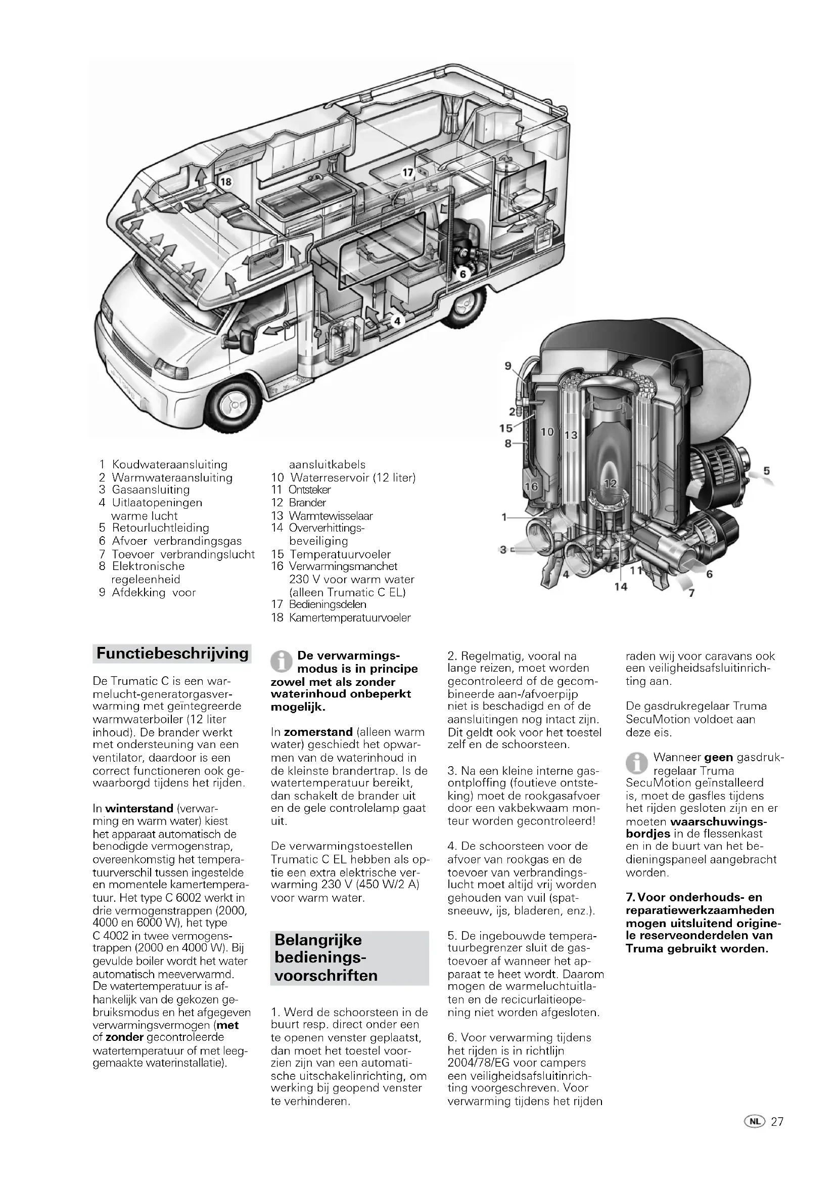 garanzia L'indirizzo del produttore è il seguente: Truma Gerätetechnik GmbH & Co. KG, Wernher-von-Braun-Straße 12, 85640 Putzbrunn. In Germania, in caso di gua- sti occorre rivolgersi, in linea di principio, al centro di assi- stenza Truma; negli altri pae- si, sono disponibili i rispettivi partner per l’assistenza (v. opuscolo centri di assi- stenza Truma o il sito www.truma.com). I reclami devono essere descritti con precisione. Inoltre, occorre presentare il documento di garanzia debitamente com- pilato o indicare il numero di serie e la data di acquisto della stufa. Perché il costruttore possa verificare se sussiste il diritto alla garanzia, il consumatore finale dovrà farsi carico a proprio rischio del trasporto o della spedizione dell’appa- recchio presso il costruttore stesso. Per danni su ra diatori (scambiatori di calore) invia- re anche il regolatore per la pressione del gas. In caso di recapito presso lo stabilimento la spedizione dovrà avvenire come mer- ce. Se si presta garanzia, lo stabilimento sosterrà i costi di trasporto ovvero i costi di invio e della spedizione di ri- torno. Se l’evento di garanzia non si verifica, la Casa tra- smette al cliente una segna- lazione specifica, indicando i costi di riparazione che la Ca- sa non si assume; in tal caso anche i costi di trasporto vanno a carico del cliente. 261 Koudwateraansluiting 2 Warmwateraansluiting 3 Gasaansluiting 4 Uitlaatopeningen warme lucht 5 Retourluchtleiding 6 Afvoer verbrandingsgas 7 Toevoer verbrandingslucht 8 Elektronische regeleenheid 9 Afdekking voor aansluitkabels 10 Waterreservoir (12 liter) 11 Ontsteker 12 Brander 13 Warmtewisselaar 14 Oververhittings- beveiliging 15 Temperatuurvoeler 16 Verwarmingsmanchet 230 V voor warm water (alleen Trumatic C EL) 17 Bedieningsdelen 18 Kamertemperatuurvoeler Functiebeschrijving De Trumatic C is een war- melucht-generatorgasver- warming met geïntegreerde warmwaterboiler (12 liter inhoud). De brander werkt met ondersteuning van een ventilator, daardoor is een correct functioneren ook ge- waarborgd tijdens het rijden. In winterstand (verwar- ming en warm water) kiest het apparaat automatisch de benodigde vermogenstrap, overeenkomstig het tempera- tuurverschil tussen ingestelde en momentele kamertempera- tuur. Het type C 6002 werkt in drie vermogenstrappen (2000, 4000 en 6000 W), het type C 4002 in twee vermogens- trappen (2000 en 4000 W). Bij gevulde boiler wordt het water automatisch meeverwarmd. De watertemperatuur is af- hankelijk van de gekozen ge- bruiksmodus en het afgegeven verwarmingsvermogen (met of zonder gecontroleerde watertemperatuur of met leeg- gemaakte waterinstallatie). De verwarmings- modus is in principe zowel met als zonder waterinhoud onbeperkt mogelijk. In zomerstand (alleen warm water) geschiedt het opwar- men van de waterinhoud in de kleinste brandertrap. Is de watertemperatuur bereikt, dan schakelt de brander uit en de gele controlelamp gaat uit. De verwarmingstoestellen Trumatic C EL hebben als op- tie een extra elektrische ver- warming 230 V (450 W/2 A) voor warm water. Belangrijke bedienings- voorschriften