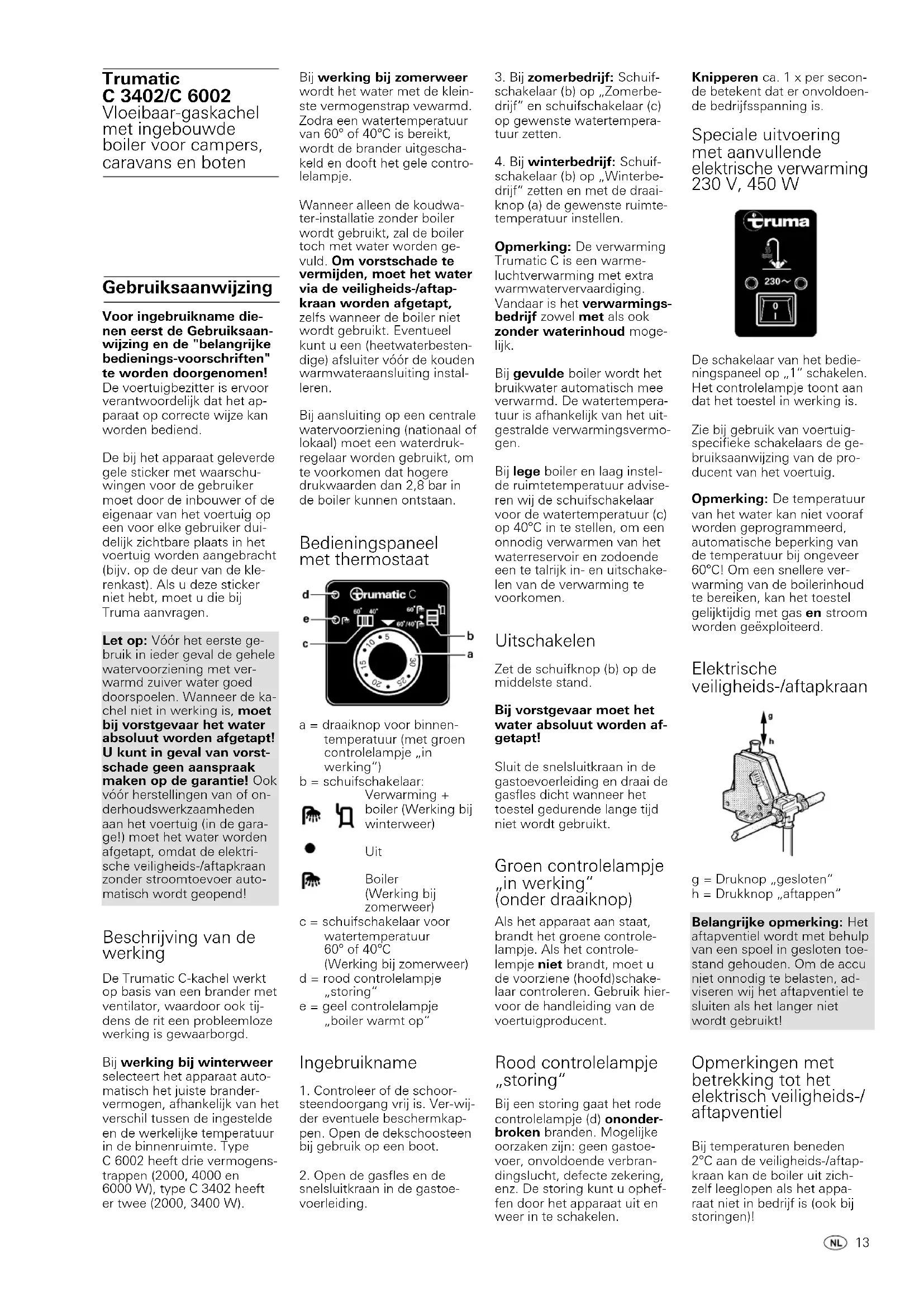 di garanzia L’indirizzo del costruttore è il seguente: Truma Gerätetech- nik GmbH & Co. KG, Wernher- von-Braun-Straße 12, 85640 Putzbrunn. In caso di guasti, in Germania occorrerà contattare il centralino del servizio di assi- stenza Truma; all’estero sono disponibili i rispettivi partner di assistenza (vedi elenco con in- dirizzi). I reclami devono essere dettagliati. E inoltre necessario presentare il certificato di ga- ranzia correttamente compilato o indicare il numero di fabbri- cazione dell’ apparecchio e la data d’acquisto. Perché il costruttore possa ve- rificare se sussiste il diritto alla garanzia, il consumatore finale dovrà farsi carico a proprio ri- schio del trasporto o della spe- dizione dell’apparecchio pres- so il costruttore stesso. Per danni su radiatori (scambiatori di calore) inviare anche il rego- latore per la pressione del gas. In caso di recapito presso lo stabilimento la spedizione do- vrà avvenire come merce. Se si presta garanzia, lo stabili- mento sosterrà i costi di tra- sporto ovvero i costi di invio e della spedizione di ritorno. Se l’evento di garanzia non si veri- fica, la Casa trasmette al clien- te una segnalazione specifica, indicando i costi di riparazione che la Casa non si assume; in tal caso anche i costi di tra- sporto vanno a carico del cliente.Knipperen ca. 1 x per secon- de betekent dat er onvoldoen- de bedrijfsspanning is. Speciale uitvoering met aanvullende elektrische verwarming 230 V, 450 W De schakelaar van het bedie- ningspaneel op „1“ schakelen. Het controlelampje toont aan dat het toestel in werking is. Zie bij gebruik van voertuig- specifieke schakelaars de ge- bruiksaanwijzing van de pro- ducent van het voertuig. Opmerking: De temperatuur van het water kan niet vooraf worden geprogrammeerd, automatische beperking van de temperatuur bij ongeveer 60°C! Om een snellere ver- warming van de boilerinhoud te bereiken, kan het toestel gelijktijdig met gas en stroom worden geëxploiteerd. Elektrische veiligheids-/aftapkraan g = Druknop „gesloten“ h = Drukknop „aftappen“ Belangrijke opmerking: Het aftapventiel wordt met behulp van een spoel in gesloten toe- stand gehouden. Om de accu niet onnodig te belasten, ad- viseren wij het aftapventiel te sluiten als het langer niet wordt gebruikt! Opmerkingen met betrekking tot het elektrisch veiligheids-/ aftapventiel Bij temperaturen beneden 2°C aan de veiligheids-/aftap- kraan kan de boiler uit zich- zelf leeglopen als het appa- raat niet in bedrijf is (ook bij storingen)! Voor ingebruikname die- nen eerst de Gebruiksaan- wijzing en de "belangrijke bedienings-voorschriften" te worden doorgenomen! De voertuigbezitter is ervoor verantwoordelijk dat het ap- paraat op correcte wijze kan worden bediend. De bij het apparaat geleverde gele sticker met waarschu- wingen voor de gebruiker moet door de inbouwer of de eigenaar van het voertuig op een voor elke gebruiker dui- delijk zichtbare plaats in het voertuig worden aangebracht (bijv. op de deur van de kle- renkast). Als u deze sticker niet hebt, moet u die bij Truma aanvragen. Let op: Vóór het eerste ge- bruik in ieder geval de gehele watervoorziening met ver- warmd zuiver water goed doorspoelen. Wanneer de ka- chel niet in werking is, moet bij vorstgevaar het water absoluut worden afgetapt! U kunt in geval van vorst- schade geen aanspraak maken op de garantie! Ook vóór herstellingen van of on- derhoudswerkzaamheden aan het voertuig (in de gara- ge!) moet het water worden afgetapt, omdat de elektri- sche veiligheids-/aftapkraan zonder stroomtoevoer auto- matisch wordt geopend! Beschrijving van de werking De Trumatic C-kachel werkt op basis van een brander met ventilator, waardoor ook tij- dens de rit een probleemloze werking is gewaarborgd. Bij werking bij winterweer selecteert het apparaat auto- matisch het juiste brander- vermogen, afhankelijk van het verschil tussen de ingestelde en de werkelijke temperatuur in de binnenruimte. Type C 6002 heeft drie vermogens- trappen (2000, 4000 en 6000 W), type C 3402 heeft er twee (2000, 3400 W). Bij werking bij zomerweer wordt het water met de klein- ste vermogenstrap vewarmd. Zodra een watertemperatuur van 60° of 40°C is bereikt, wordt de brander uitgescha- keld en dooft het gele contro- lelampje. Wanneer alleen de koudwa- ter-installatie zonder boiler wordt gebruikt, zal de boiler toch met water worden ge- vuld. Om vorstschade te vermijden, moet het water via de veiligheids-/aftap- kraan worden afgetapt, zelfs wanneer de boiler niet wordt gebruikt. Eventueel kunt u een (heetwaterbesten- dige) afsluiter vóór de kouden warmwateraansluiting instal- leren. Bij aansluiting op een centrale watervoorziening (nationaal of lokaal) moet een waterdruk- regelaar worden gebruikt, om te voorkomen dat hogere drukwaarden dan 2,8 bar in de boiler kunnen ontstaan. Bedieningspaneel met thermostaat a = draaiknop voor binnen- temperatuur (met groen controlelampje „in werking“) b = schuifschakelaar: Verwarming + boiler (Werking bij winterweer) Uit Boiler (Werking bij zomerweer) c = schuifschakelaar voor watertemperatuur 60° of 40°C (Werking bij zomerweer) d = rood controlelampje „storing“ e = geel controlelampje „boiler warmt op“ Ingebruikname