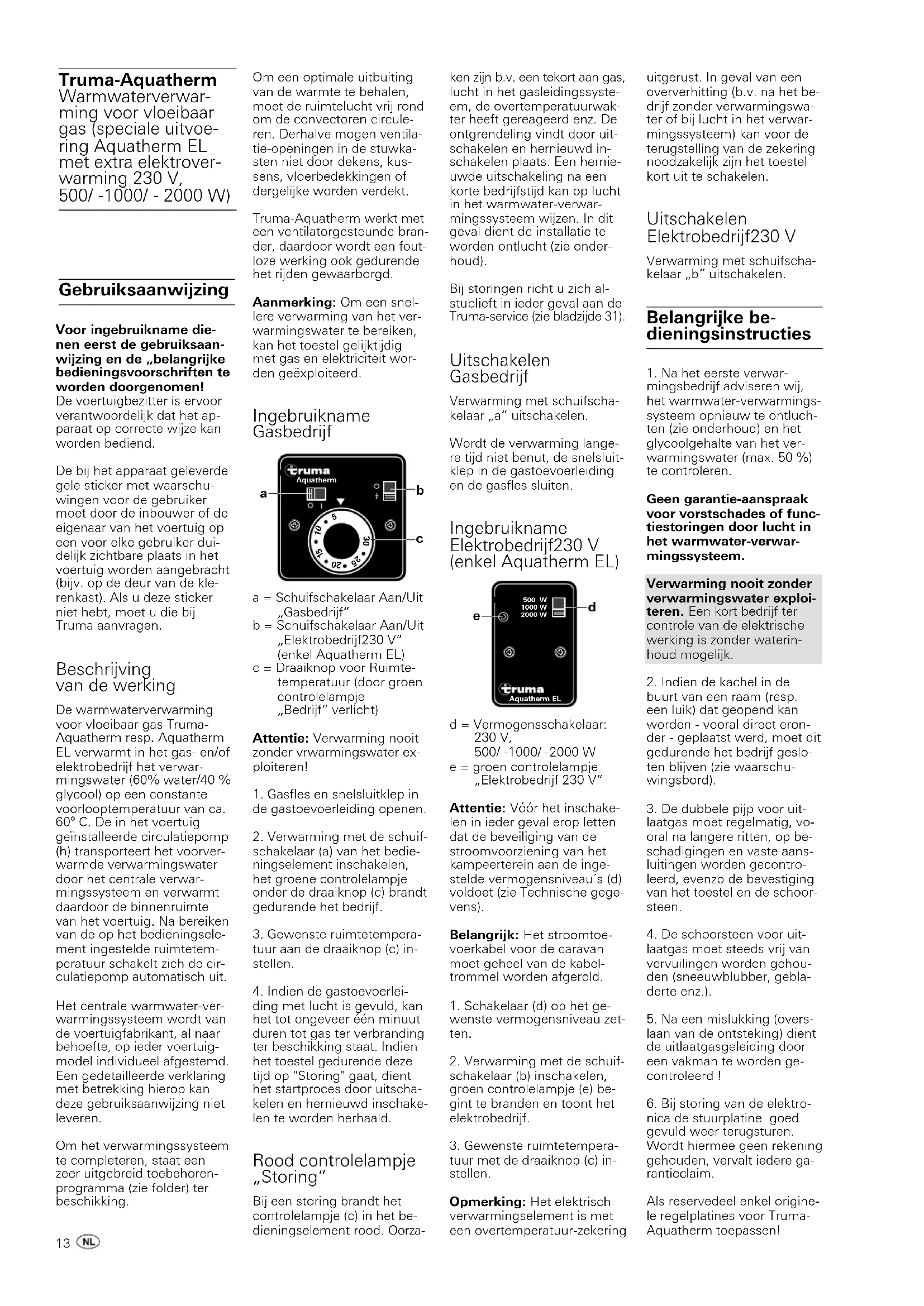 nica de stuurplatine goed gevuld weer terugsturen. Wordt hiermee geen rekening gehouden, vervalt iedere ga- rantieclaim. Als reservedeel enkel origine- le regelplatines voor Truma- Aquatherm toepassen! Om een optimale uitbuiting van de warmte te behalen, moet de ruimtelucht vrij rond om de convectoren circule- ren. Derhalve mogen ventila- tie-openingen in de stuwka- sten niet door dekens, kus- sens, vloerbedekkingen of dergelijke worden verdekt. Truma-Aquatherm werkt met een ventilatorgesteunde bran- der, daardoor wordt een fout- loze werking ook gedurende het rijden gewaarborgd. Aanmerking: Om een snel- lere verwarming van het ver- warmingswater te bereiken, kan het toestel gelijktijdig met gas en elektriciteit wor- den geëxploiteerd. Ingebruikname Gasbedrijf a = Schuifschakelaar Aan/Uit „Gasbedrijf“ b = Schuifschakelaar Aan/Uit „Elektrobedrijf230 V“ (enkel Aquatherm EL) c = Draaiknop voor Ruimte- temperatuur (door groen controlelampje „Bedrijf“ verlicht) Attentie: Verwarming nooit zonder vrwarmingswater ex- ploiteren!