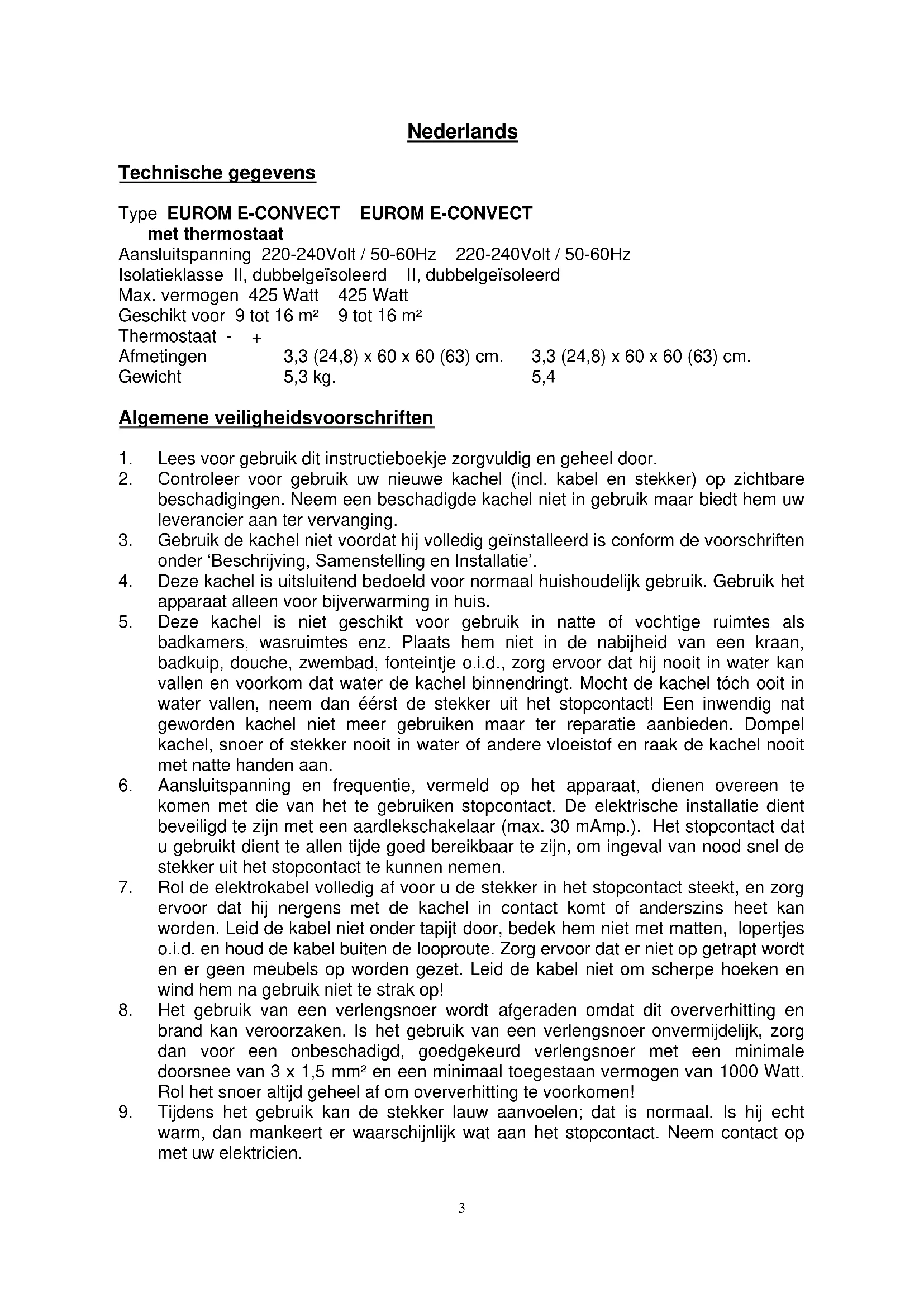 Hierbij verklaart Euromac bv., Genemuiden-NL dat het product elektrische convectorkachel, merk EUROM, type E-CONVECT & E-CONVECT met thermostaat voldoet aan de LVD-richtlijn 2006/95/EC en aan de EMC-richtlijn 2004/108/EG, en in overeenstemming is met de onderstaande normen: