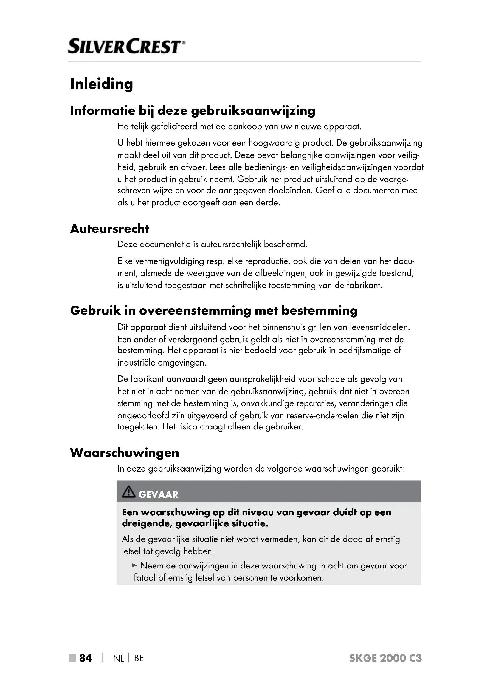Inleiding Informatie bij deze gebruiksaanwijzing Hartelijk gefeliciteerd met de aankoop van uw nieuwe apparaat. U hebt hiermee gekozen voor een hoogwaardig product. De gebruiksaanwijzing maakt deel uit van dit product. Deze bevat belangrijke aanwijzingen voor veilig- heid, gebruik en afvoer. Lees alle bedienings- en veiligheidsaanwijzingen voordat u het product in gebruik neemt. Gebruik het product uitsluitend op de voorge- schreven wijze en voor de aangegeven doeleinden. Geef alle documenten mee als u het product doorgeeft aan een derde. Auteursrecht Deze documentatie is auteursrechtelijk beschermd. Elke vermenigvuldiging resp. elke reproductie, ook die van delen van het docu- ment, alsmede de weergave van de afbeeldingen, ook in gewijzigde toestand, is uitsluitend toegestaan met schriftelijke toestemming van de fabrikant. Gebruik in overeenstemming met bestemming Dit apparaat dient uitsluitend voor het binnenshuis grillen van levensmiddelen. Een ander of verdergaand gebruik geldt als niet in overeenstemming met de bestemming. Het apparaat is niet bedoeld voor gebruik in bedrijfsmatige of industriële omgevingen. De fabrikant aanvaardt geen aansprakelijkheid voor schade als gevolg van het niet in acht nemen van de gebruiksaanwijzing, gebruik dat niet in overeen- stemming met de bestemming is, onvakkundige reparaties, veranderingen die ongeoorloofd zijn uitgevoerd of gebruik van reserve-onderdelen die niet zijn toegelaten. Het risico draagt alleen de gebruiker. Waarschuwingen In deze gebruiksaanwijzing worden de volgende waarschuwingen gebruikt: GEVAAR Een waarschuwing op dit niveau van gevaar duidt op een dreigende, gevaarlijke situatie. Als de gevaarlijke situatie niet wordt vermeden, kan dit de dood of ernstig letsel tot gevolg hebben. ► Neem de aanwijzingen in deze waarschuwing in acht om gevaar voor fataal of ernstig letsel van personen te voorkomen.SKGE 2000 C3