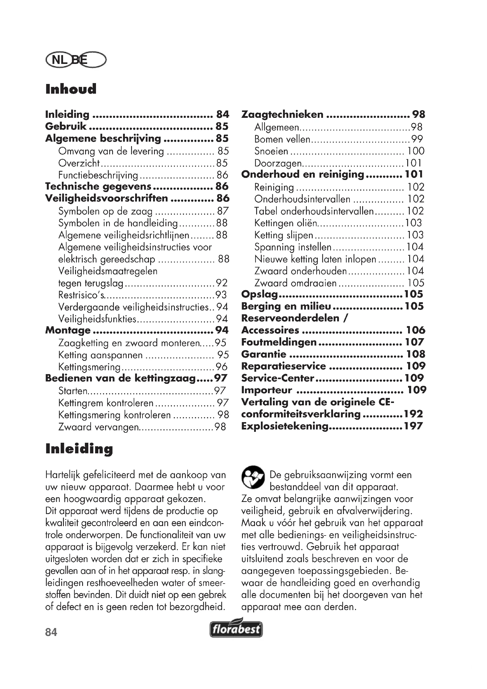 Zaagtanden scherpen of nieu- we ketting spannen Ontoereikende spanning Spanning kontroleren Zaag loopt moei- zaam, ketting springt los Onvoldoende spanning Spanning kontroleren Ketting wordt heet, rookontwikkeling b zagen, verkleuring van het zwaard Te wenig olie Oliepeil kontroleren en ev. olie bvullen, Olie-automatisme kontroleren en ev. olietoevoer reinigen of reparatie door klantendienst Oliefnafstellinig (olietoevoer- knop) controleren108 NL BE Garantie Geachte cliënte, geachte klant, U krgt op dit apparaat 3 jaar garantie, te rekenen vanaf de datum van aankoop. Ingeval van gebreken aan dit product heeft u tegenover de verkoper van het product wettelke rechten. Deze wettelke rechten worden door onze hierna beschre- ven garantie niet beperkt. Garantievoorwaarden De garantietermn begint met de datum van aankoop. Gelieve de originele kassa- bon goed te bewaren. Dit document wordt als bews van de aankoop benodigd. Indien er zich binnen drie jaar, te rekenen vanaf de datum van aankoop van dit pro- duct, een materiaal- of fabricagefout voor- doet, wordt het product door ons – naar onze keuze – voor u gratis gerepareerd of vervangen. Deze garantievergoeding stelt voorop dat binnen de termn van drie jaar het defecte apparaat en het bews van aankoop (kassabon) voorgelegd en dat schriftelk kort beschreven wordt, waarin het gebrek bestaat en wanneer het zich voorgedaan heeft. Als het defect door onze garantie gedekt is, krgt u het gerepareerde of een nieuw product terug. Met herstelling of uitwisse- ling van het product begint er geen nieuwe garantieperiode. Garantieperiode en wettelijke kwaliteitsgarantie De garantieperiode wordt door de ga- rantievergoeding niet verlengd. Dit geldt ook voor vervangen en gerepareerde onderdelen. Eventueel al b de aankoop bestaande beschadigingen en gebreken moeten onmiddellk na het uitpakken ge- meld worden. Na het verstrken van de garantieperiode tot stand komende repara- ties worden tegen verplichte betaling van de kosten uitgevoerd. Omvang van de garantie Het apparaat werd volgens strikte kwali- teitsrichtlnen zorgvuldig geproduceerd en vóór aevering nauwgezet getest. De garantievergoeding geldt voor materi- aal- of fabricagefouten. Deze garantie is niet van toepassing op productonderdelen, die aan een normale sltage blootgesteld zn en daarom als aan sltage onderhevi- ge onderdelen beschouwd kunnen worden (b.v. ketting) of op beschadigingen aan breekbare onderdelen (b.v. schakelaars). Deze garantie valt weg wanneer het pro- duct beschadigd, niet oordeelkundig ge- bruikt of niet onderhouden werd. Voor een vakkundig gebruik van het product dienen alle in de gebruiksaanwzing vermelde aanwzingen nauwgezet in acht genomen te worden. Gebruiksdoeleinden en hande- lingen, die in de gebruiksaanwzing afge- raden worden of waarvoor gewaarschuwd wordt, dienen onvoorwaardelk vermeden te worden. Het product is uitsluitend voor het privé- en niet voor het commerciële gebruik be- stemd. B een verkeerde of onoordeelkun- dige behandeling, toepassing van geweld en b ingrepen, die niet door het door ons geautoriseerde serviceliaal doorgevoerd werden, valt de garantie weg. Afhandeling ingeval van garantie Gelieve aan de volgende aanwzingen gevolg te geven om een snelle behande- ling van uw verzoek te garanderen: