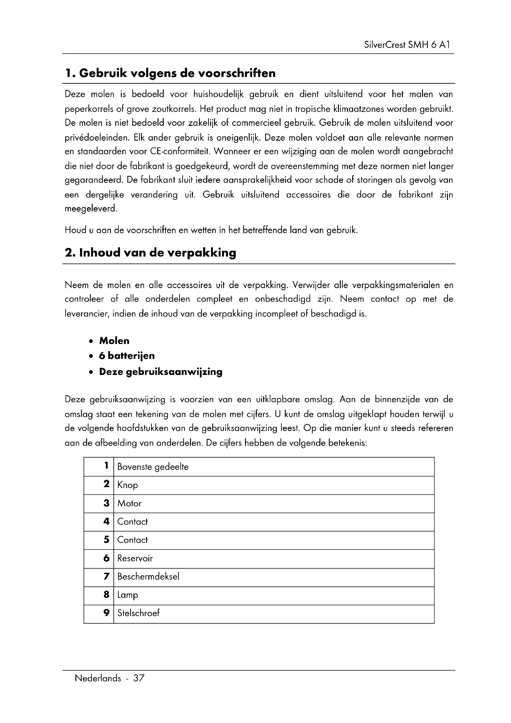 Neem de molen en alle accessoires uit de verpakking. Verwijder alle verpakkingsmaterialen en controleer of alle onderdelen compleet en onbeschadigd zijn. Neem contact op met de leverancier, indien de inhoud van de verpakking incompleet of beschadigd is. Molen 6 batterijen Deze gebruiksaanwijzing Deze gebruiksaanwijzing is voorzien van een uitklapbare omslag. Aan de binnenzijde van de omslag staat een tekening van de molen met cijfers. U kunt de omslag uitgeklapt houden terwijl u de volgende hoofdstukken van de gebruiksaanwijzing leest. Op die manier kunt u steeds refereren aan de afbeelding van onderdelen. De cijfers hebben de volgende betekenis:
