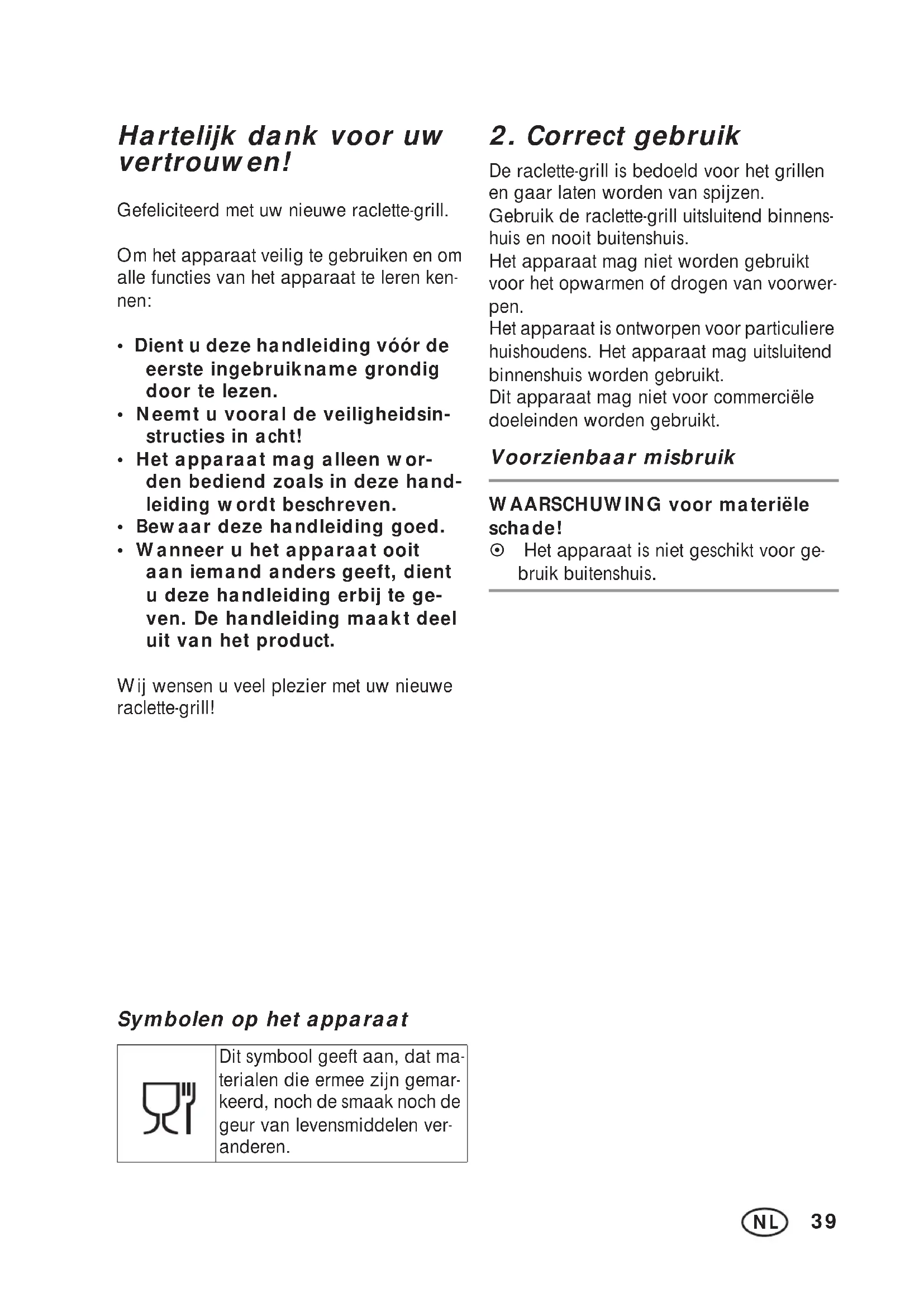 De raclette-grill is bedoeld voor het grillen en gaar laten worden van spijzen. Gebruik de raclette-grill uitsluitend binnens- huis en nooit buitenshuis. Het apparaat mag niet worden gebruikt voor het opwarmen of drogen van voorwer- pen. Het apparaat is ontworpen voor particuliere huishoudens. Het apparaat mag uitsluitend binnenshuis worden gebruikt. Dit apparaat mag niet voor commerciële doeleinden worden gebruikt. Voorzienbaar misbruik WAARSCHUWING voor materiële schade! ~ Het apparaat is niet geschikt voor ge- bruik buitenshuis. Dit symbool geeft aan, dat ma- terialen die ermee zijn gemar- keerd, noch de smaak noch de geur van levensmiddelen ver- anderen.40