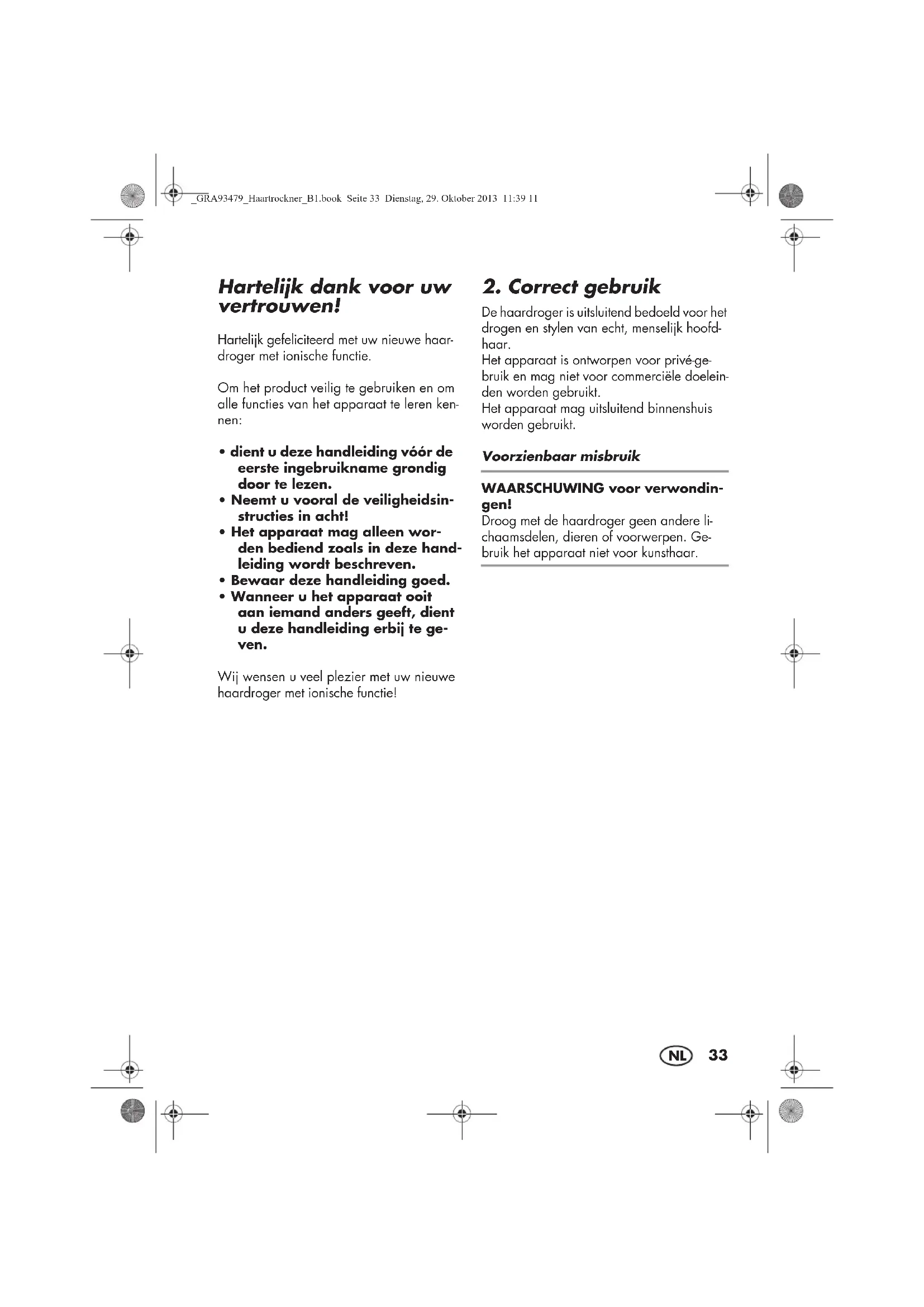 De haardroger is uitsluitend bedoeld voor het drogen en stylen van echt, menselijk hoofd- haar. Het apparaat is ontworpen voor privé-ge- bruik en mag niet voor commerciële doelein- den worden gebruikt. Het apparaat mag uitsluitend binnenshuis worden gebruikt. Voorzienbaar misbruik WAARSCHUWING voor verwondin- gen! Droog met de haardroger geen andere li- chaamsdelen, dieren of voorwerpen. Ge- bruik het apparaat niet voor kunsthaar. _GRA93479_Haartrockner_B1.book Seite 33 Dienstag, 29. Oktober 2013 11:39 1134