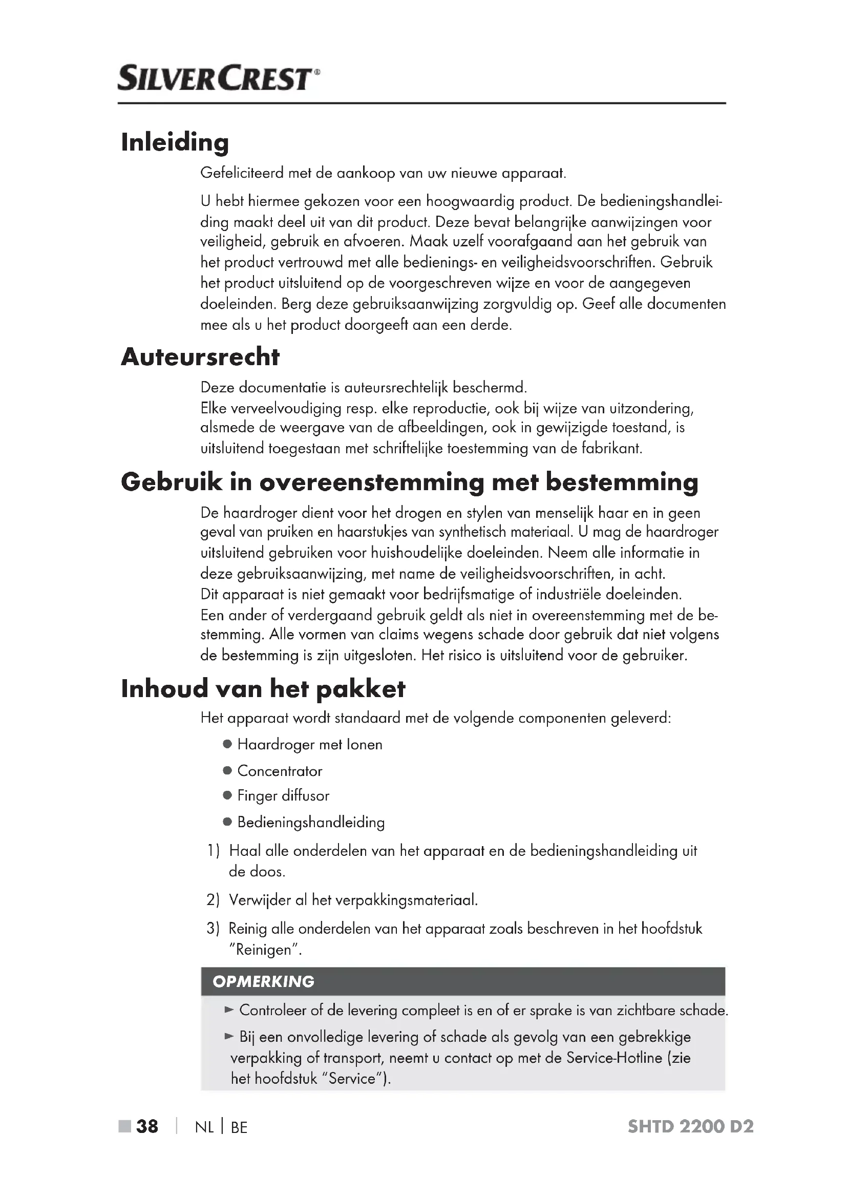 SHTD 2200 D2 Inleiding Gefeliciteerd met de aankoop van uw nieuwe apparaat. U hebt hiermee gekozen voor een hoogwaardig product. De bedieningshandlei- ding maakt deel uit van dit product. Deze bevat belangrijke aanwijzingen voor veiligheid, gebruik en afvoeren. Maak uzelf voorafgaand aan het gebruik van het product vertrouwd met alle bedienings- en veiligheidsvoorschriften. Gebruik het product uitsluitend op de voorgeschreven wijze en voor de aangegeven doeleinden. Berg deze gebruiksaanwijzing zorgvuldig op. Geef alle documenten mee als u het product doorgeeft aan een derde. Auteursrecht Deze documentatie is auteursrechtelijk beschermd. Elke verveelvoudiging resp. elke reproductie, ook bij wijze van uitzondering, alsmede de weergave van de afbeeldingen, ook in gewijzigde toestand, is uitsluitend toegestaan met schriftelijke toestemming van de fabrikant. Gebruik in overeenstemming met bestemming De haardroger dient voor het drogen en stylen van menselijk haar en in geen geval van pruiken en haarstukjes van synthetisch materiaal. U mag de haardroger uitsluitend gebruiken voor huishoudelijke doeleinden. Neem alle informatie in deze gebruiksaanwijzing, met name de veiligheidsvoorschriften, in acht. Dit apparaat is niet gemaakt voor bedrijfsmatige of industriële doeleinden. Een ander of verdergaand gebruik geldt als niet in overeenstemming met de be- stemming. Alle vormen van claims wegens schade door gebruik dat niet volgens de bestemming is zijn uitgesloten. Het risico is uitsluitend voor de gebruiker. Inhoud van het pakket Het apparaat wordt standaard met de volgende componenten geleverd: ▯ Haardroger met Ionen ▯ Concentrator ▯ Finger diffusor ▯ Bedieningshandleiding