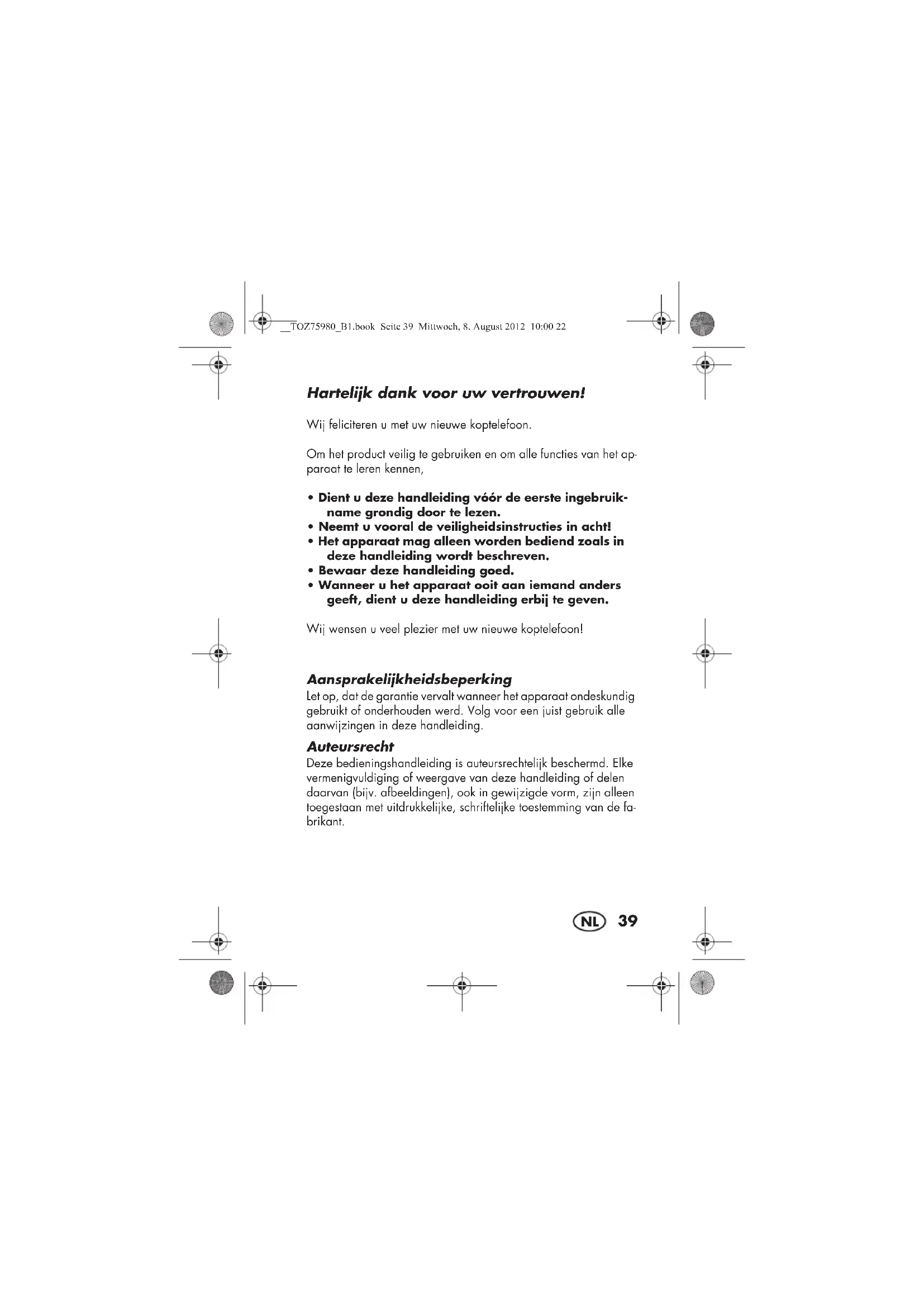 - Wanneer u het apparaat ooit aan iemand anders geeft, dient u deze handleiding erbij te geven. Wij wensen u veel plezier met uw nieuwe koptelefoon! Aansprakelijkheidsbeperking Let op, dat de garantie vervalt wanneer het apparaat ondeskundig gebruikt of onderhouden werd. Volg voor een juist gebruik alle aanwijzingen in deze handleiding. Auteursrecht Deze bedieningshandleiding is auteursrechtelijk beschermd. Elke vermenigvuldiging of weergave van deze handleiding of delen daarvan (bijv. afbeeldingen), ook in gewijzigde vorm, zijn alleen toegestaan met uitdrukkelijke, schriftelijke toestemming van de fa- brikant. __TOZ75980_B1.book Seite 39 Mittwoch, 8. August 2012 10:00 2240