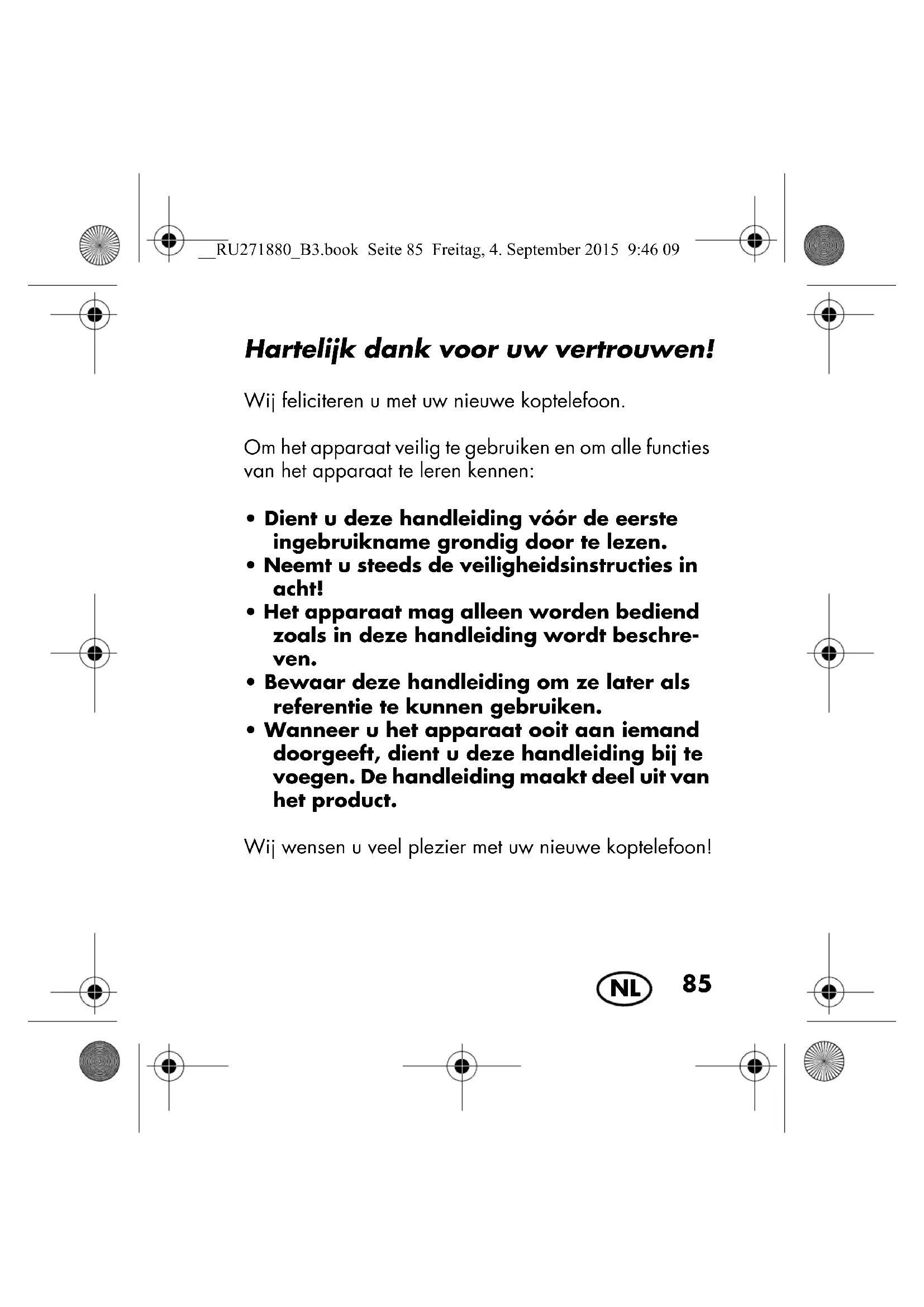 Hartelijk dank voor uw vertrouwen! Wij feliciteren u met uw nieuwe koptelefoon. Om het apparaat veilig te gebruiken en om alle functies van het apparaat te leren kennen: