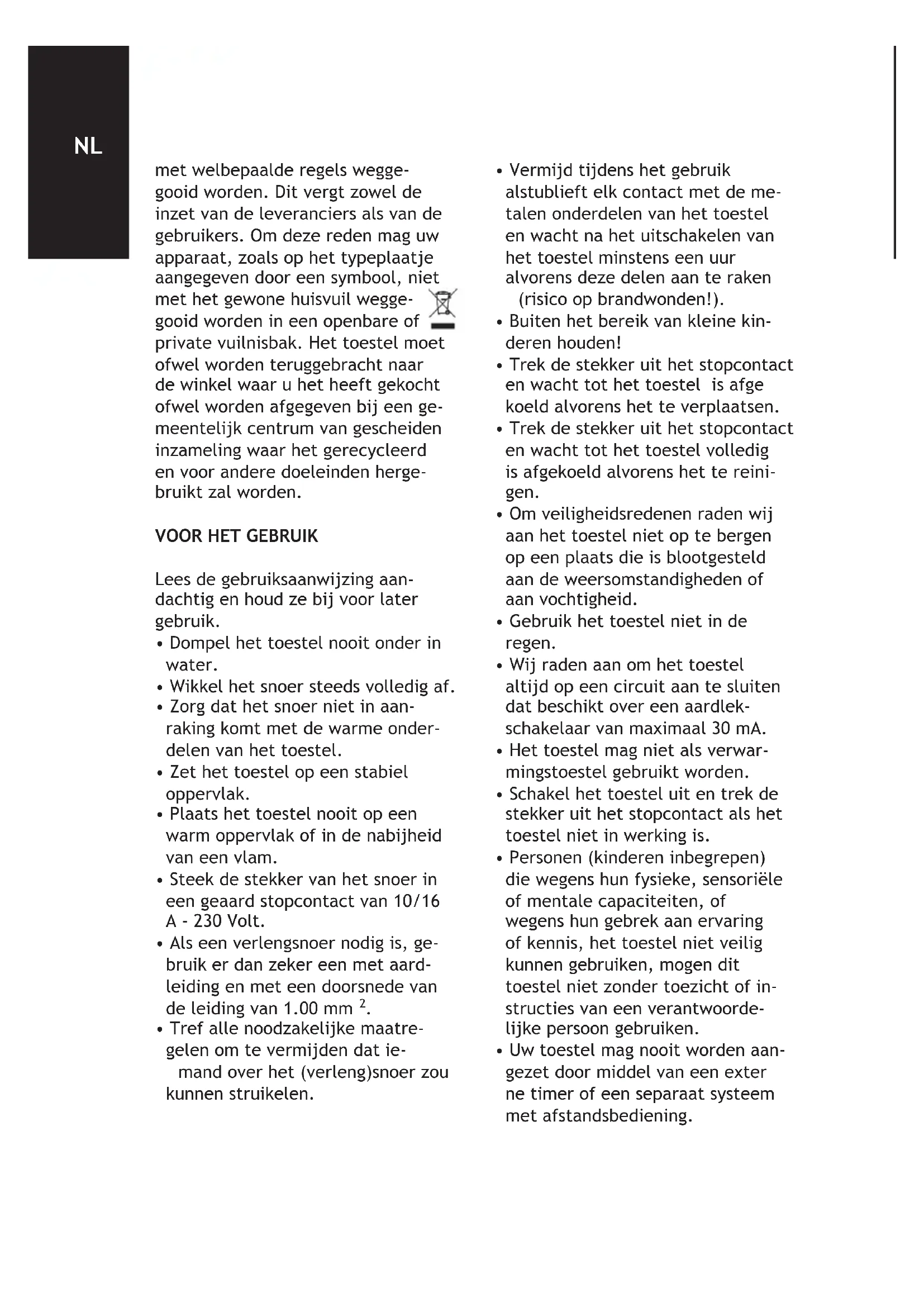 Vermijdijdens het gebruik alstublieft elk contact met de metalen onderdelen van het toestelen wacht na het uitschakelen van het toestel minstens een uur alvorens deze delen aan te raken (risico op brandwonden!).