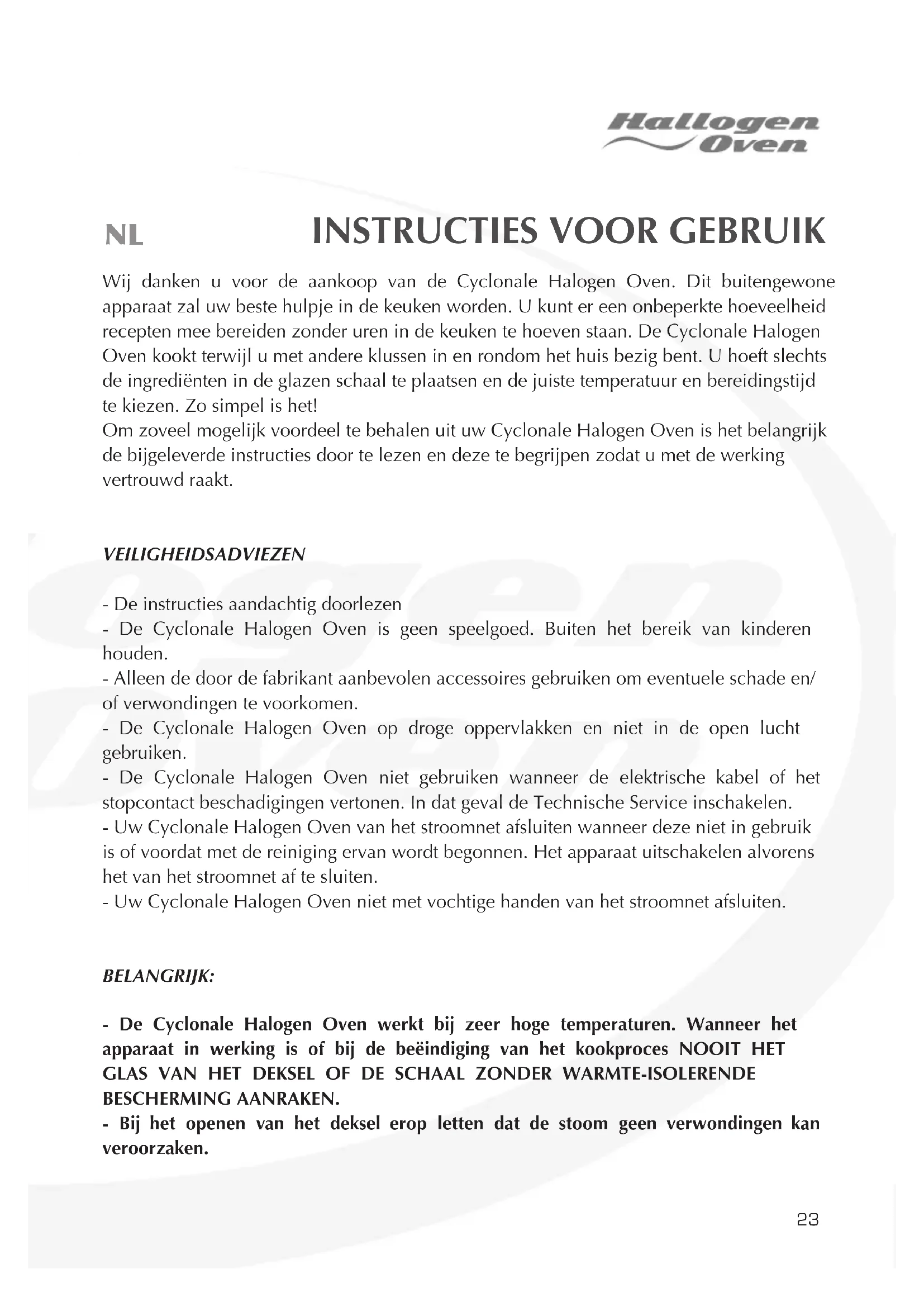 Il simbolo di un container su ruote barrato indica che è obbligatorio informarsi e seguire la normativa locale vigente per la dismissione e rottamazione di questo prodotto. Non eliminare questo prodotto assieme ai riuti domestici. Rispettare sempre le normative locali pertinenti. I componenti elettrici ed elettronici contengono sostanze pericolose che hanno effetti nocivi sull’ambiente o sulla salute umana e devono essere riciclati adeguatamente. IT23 Wij danken u voor de aankoop van de Cyclonale Halogen Oven. Dit buitengewone apparaat zal uw beste hulpje in de keuken worden. U kunt er een onbeperkte hoeveelheid recepten mee bereiden zonder uren in de keuken te hoeven staan. De Cyclonale Halogen Oven kookt terwijl u met andere klussen in en rondom het huis bezig bent. U hoeft slechts de ingrediënten in de glazen schaal te plaatsen en de juiste temperatuur en bereidingstijd te kiezen. Zo simpel is het! Om zoveel mogelijk voordeel te behalen uit uw Cyclonale Halogen Oven is het belangrijk de bijgeleverde instructies door te lezen en deze te begrijpen zodat u met de werking vertrouwd raakt. VEILIGHEIDSADVIEZEN - De instructies aandachtig doorlezen - De Cyclonale Halogen Oven is geen speelgoed. Buiten het bereik van kinderen houden. - Alleen de door de fabrikant aanbevolen accessoires gebruiken om eventuele schade en/ of verwondingen te voorkomen. - De Cyclonale Halogen Oven op droge oppervlakken en niet in de open lucht gebruiken. - De Cyclonale Halogen Oven niet gebruiken wanneer de elektrische kabel of het stopcontact beschadigingen vertonen. In dat geval de Technische Service inschakelen. - Uw Cyclonale Halogen Oven van het stroomnet afsluiten wanneer deze niet in gebruik is of voordat met de reiniging ervan wordt begonnen. Het apparaat uitschakelen alvorens het van het stroomnet af te sluiten. - Uw Cyclonale Halogen Oven niet met vochtige handen van het stroomnet afsluiten. BELANGRIJK: - De Cyclonale Halogen Oven werkt bij zeer hoge temperaturen. Wanneer het apparaat in werking is of bij de beëindiging van het kookproces NOOIT HET GLAS VAN HET DEKSEL OF DE SCHAAL ZONDER WARMTE-ISOLERENDE BESCHERMING AANRAKEN. - Bij het openen van het deksel erop letten dat de stoom geen verwondingen kan veroorzaken.