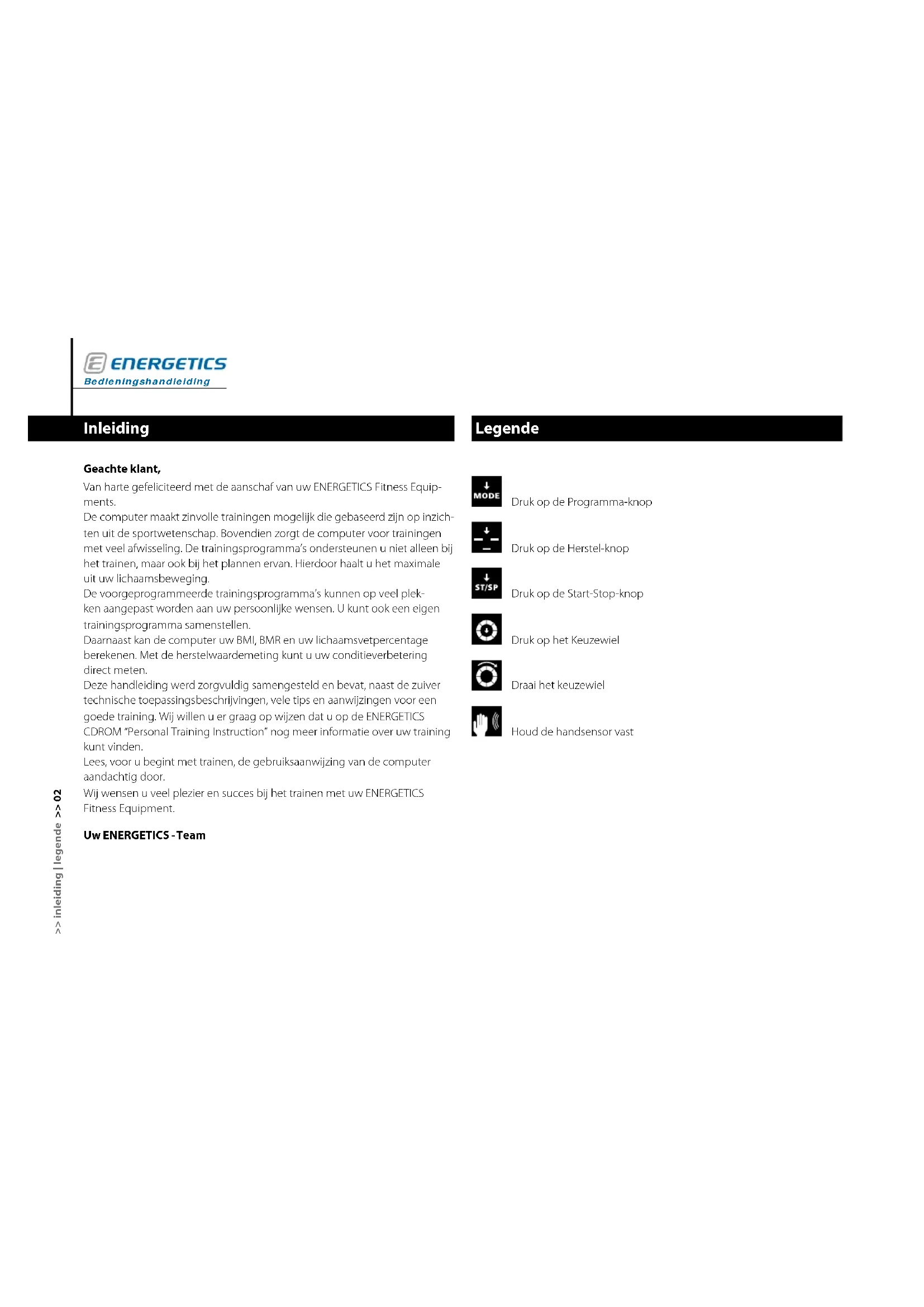 - La batteria della fascia toracica é troppo debole o scaricata. Blocco del computer Raramente, soprattutto per la modifica della tensione o per scariche statiche puó avvenire il blocco del computer. E-204 di solito si riavvia da solo. Nel caso che il computer non si riavvii da solo, effettuate il restart. Contem- poraneamente togliete l´innesto di rete, aspettate qualche secondo e poi lo riinserite nuovamente. Cura Evitare che nella custodia del computer entrino liquidi. Pulire il computer con uno straccio umido. Non utilizzare detersivi abrasivi. Manutenzione Il computer non richiede una manutenuzione particolare. Controllate rego- larmente il fissaggio delle viti e i collegamenti. I pezzi difettosi vanno sostituiti immediatamente. Contattate il venditore ENERGETICS.Istruzioni per l´uso >> 36NL Inhoud Inleiding .................................................................02 Legende .................................................................02 Het scherm en de symbolen .......................................03 De behuizing ......................................................03 Assemblage en ingebruikname ..........................................04 De computer aansluiten ...........................................04 De computer aanzetten . . . . . . . . . . . . . . . . . . . . . . . . . . . . . . . . . . . . . . . . . . . 04 Starten, instellen en pieptoon .....................................04 Slaapmodus .......................................................04 Snelstart .................................................................05 Standaardwaarden en -instellingen ......................................06 Trainingsprogramma’s – functies en instellingen .........................07 Wat is een trainingsprogramma ...................................07 Persoonlijke instellingen/trainingsparameters .....................07 Het toepassen van trainingsprogramma’s ..........................10 Algemene informatie over de programma’s ........................16 Het kiezen en instellen van de programma’s .............................17 Persoonlijke programma’s .........................................17 Handmatig programma (P 1) ................................17 Gebruikersprogramma (P 13) ................................19 Voorgeprogrammeerde programma’s .............................21 Tour (P 2) ...................................................22 Dal (P 3) .....................................................22 Heuvel (P 4) .................................................23 Berg (P 5) ...................................................23 Top (P 6) ....................................................23 Interval (P 7) ................................................23 Programma’s afhankelijk van de hartslag ...........................24 Persoonlijk hartslagprogramma (P 9) ........................24 Hartslagprogramma (P 10 – 12) .............................26 BMI-BMR-lichaamsvetmeting (P 8) .................................28 Herstelprogramma ................................................31 Pauzeren/training onderbreken en reset ...........................31 Veiligheid .........................................................32 Veelgestelde vragen .....................................................33 Service ..................................................................34 Probleemoplossing ................................................34 Gebruik ...........................................................34 Onderhoud .......................................................34 Bedieningshandleiding E-204 >> inhoud >> 01Bedieningshandleiding >> inleiding | legende >> 02 Legende Druk op de Programma-knop Druk op de Herstel-knop Druk op de Start-Stop-knop Druk op het Keuzewiel Draai het keuzewiel Houd de handsensor vast Inleiding Geachte klant, Van harte gefeliciteerd met de aanschaf van uw ENERGETICS Fitness Equip- ments. De computer maakt zinvolle trainingen mogelijk die gebaseerd zijn op inzich- ten uit de sportwetenschap. Bovendien zorgt de computer voor trainingen met veel afwisseling. De trainingsprogramma’s ondersteunen u niet alleen bij het trainen, maar ook bij het plannen ervan. Hierdoor haalt u het maximale uit uw lichaamsbeweging. De voorgeprogrammeerde trainingsprogramma’s kunnen op veel plek- ken aangepast worden aan uw persoonlijke wensen. U kunt ook een eigen trainingsprogramma samenstellen. Daarnaast kan de computer uw BMI, BMR en uw lichaamsvetpercentage berekenen. Met de herstelwaardemeting kunt u uw conditieverbetering direct meten. Deze handleiding werd zorgvuldig samengesteld en bevat, naast de zuiver technische toepassingsbeschrijvingen, vele tips en aanwijzingen voor een goede training. Wij willen u er graag op wijzen dat u op de ENERGETICS CDROM “Personal Training Instruction” nog meer informatie over uw training kunt vinden. Lees, voor u begint met trainen, de gebruiksaanwijzing van de computer aandachtig door. Wij wensen u veel plezier en succes bij het trainen met uw ENERGETICS Fitness Equipment. Uw ENERGETICS - TeamNL >> legende >> 03 Het scherm en de symbolen (D1) START – programma loopt (D2) STOP – programma onderbroken of klaar voor selectie (D3) PROGRAM – gekozen programma (D4) LEVEL – ingestelde intensiteitsniveau (D5) Geslacht – vrouw (D6) Geslacht – man (D7) Tijd-/weerstandssegmenten – trainingstijd onderverdeeld in 10 gelijke fasen (D8) ODO – totaal aantal afgelegde kilometers (D9) DIST – afgelegde afstand in kilometers in het trainingsprogramma (D10) SPEED – snelheid (in kilometers/uur) (D11) RPM – trapfrequentie (in pedaalrotaties/minuut) (D12) HEIGHT – lengte (cm) (D13) TIME – trainingstijd (in minuten) (D14) CAL – calorieverbruik in kilojoules (D15) WATT * – prestatie (Watt) (D16) TARGET HR – berekende doelhartslag (slagen/minuut) (D17) HEART RATE – huidige hartslag (slagen/minuut) (D18) knipperend: gegevensoverdracht vanaf de hartslagsensor actief (D19) WEIGHT – gewicht 