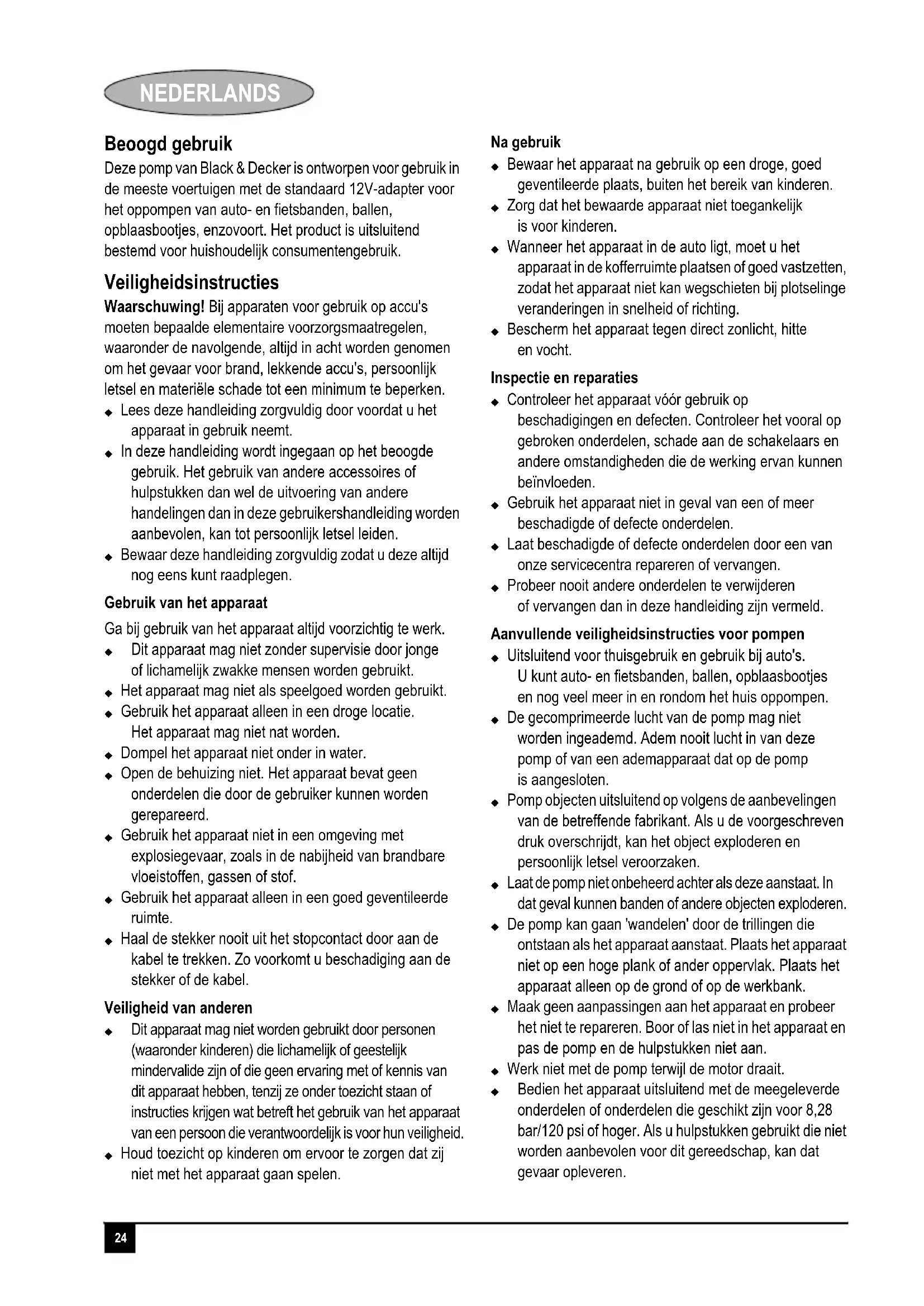 Deze pomp van Black & Decker is ontworpen voor gebruik in de meeste voertuigen met de standard 12V-adapter voor het oppompen van auto- en fietsbanden, ballen, opblaasbootjes, enzovoort. Het product isuitsuiitend bestemd voor huishoudelijk consumentengebruik.