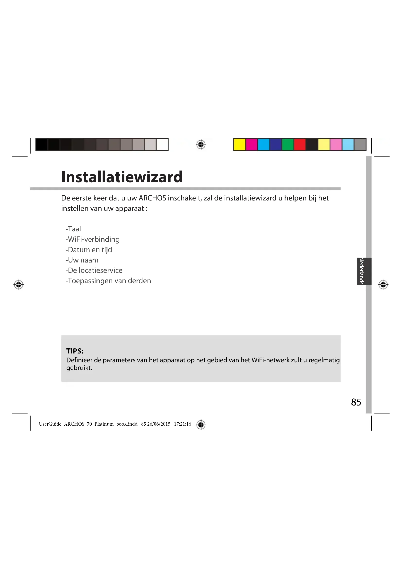 UserGuide_ARCHOS_70_Platinum_book.indd 84 26/06/2015 17:21:1685 Nederlands Installatiewizard TIPS: Definieer de parameters van het apparaat op het gebied van het WiFi-netwerk zult u regelmatig gebruikt. De eerste keer dat u uw ARCHOS inschakelt, zal de installatiewizard u helpen bij het instellen van uw apparaat : - Taal - WiFi-verbinding - Datum en tijd - Uw naam - De locatieservice - Toepassingen van derden UserGuide_ARCHOS_70_Platinum_book.indd 85 26/06/2015 17:21:1686