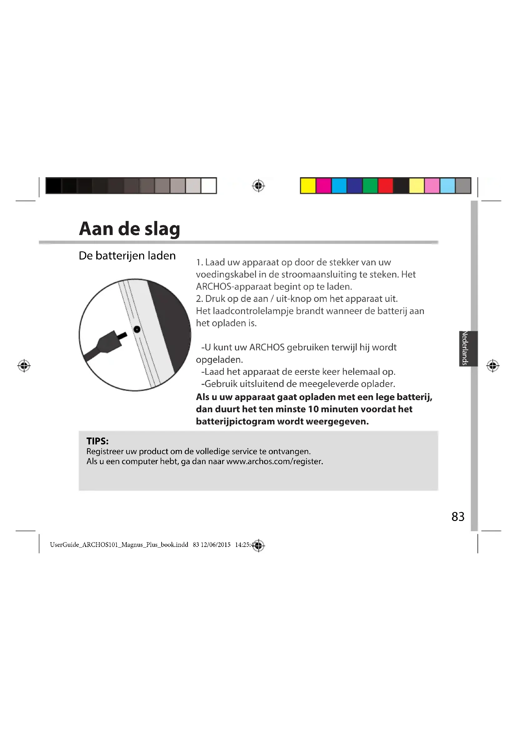 Raadpleeg de verklaring van overeenstemming op http://www.archos.com/products/declaration_conformity.html UserGuide_ARCHOS101_Magnus_Plus_book.indd 81 12/06/2015 14:25:4782 Warranty Wat zit er in de doos? USB-kabel Lader Gebruikershandleiding Garantie, wettelijke mededelingen en veiligheidsvoorschriftem ARCHOS 101 Magnus Plus UserGuide_ARCHOS101_Magnus_Plus_book.indd 82 12/06/2015 14:25:4783 Nederlands Aan de slag TIPS: Registreer uw product om de volledige service te ontvangen. Als u een computer hebt, ga dan naar www.archos.com/register. De batterijen laden