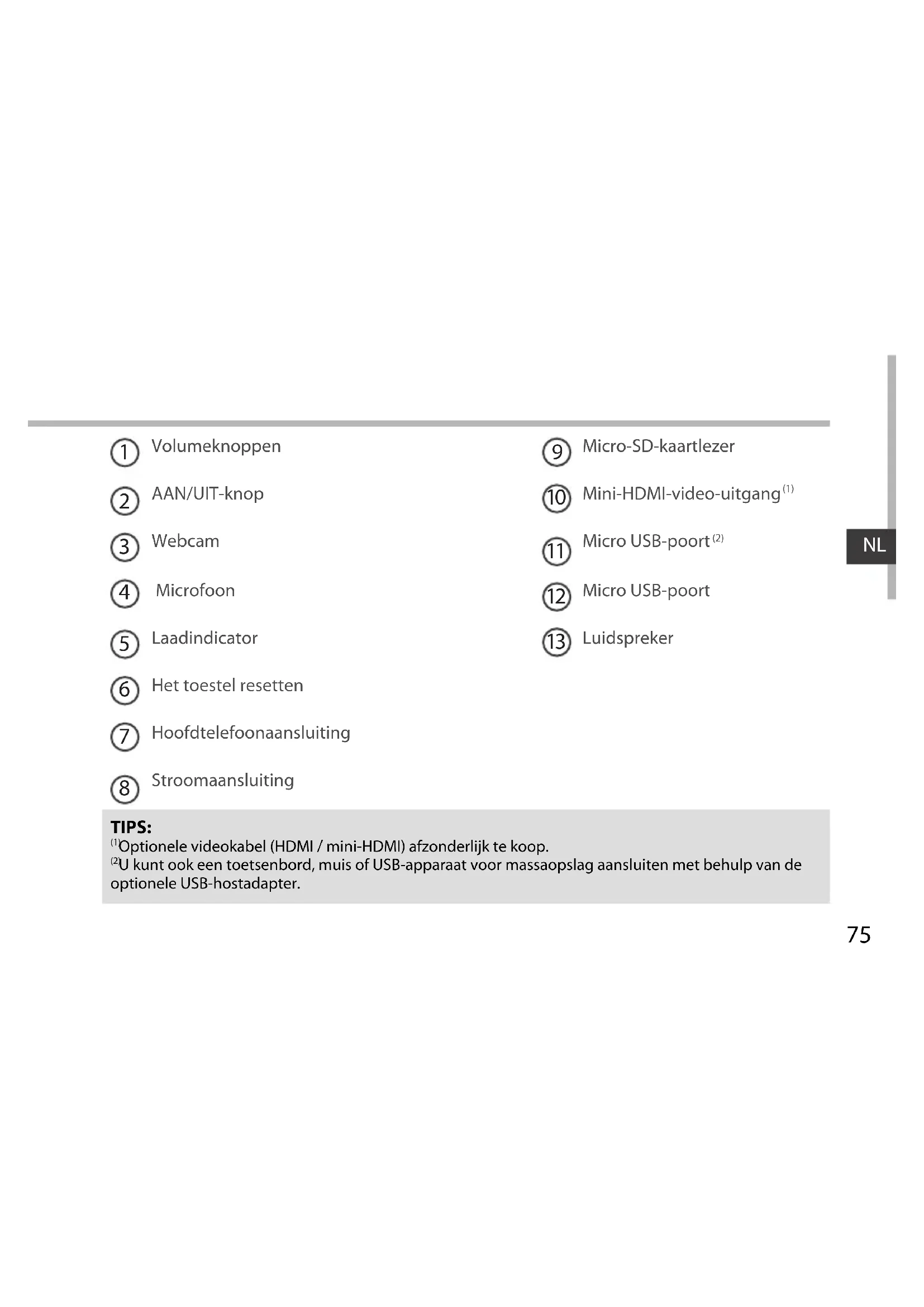 TIPS: (1) Optionele videokabel (HDMI / mini-HDMI) afzonderlijk te koop. (2) U kunt ook een toetsenbord, muis of USB-apparaat voor massaopslag aansluiten met behulp van de optionele USB-hostadapter.