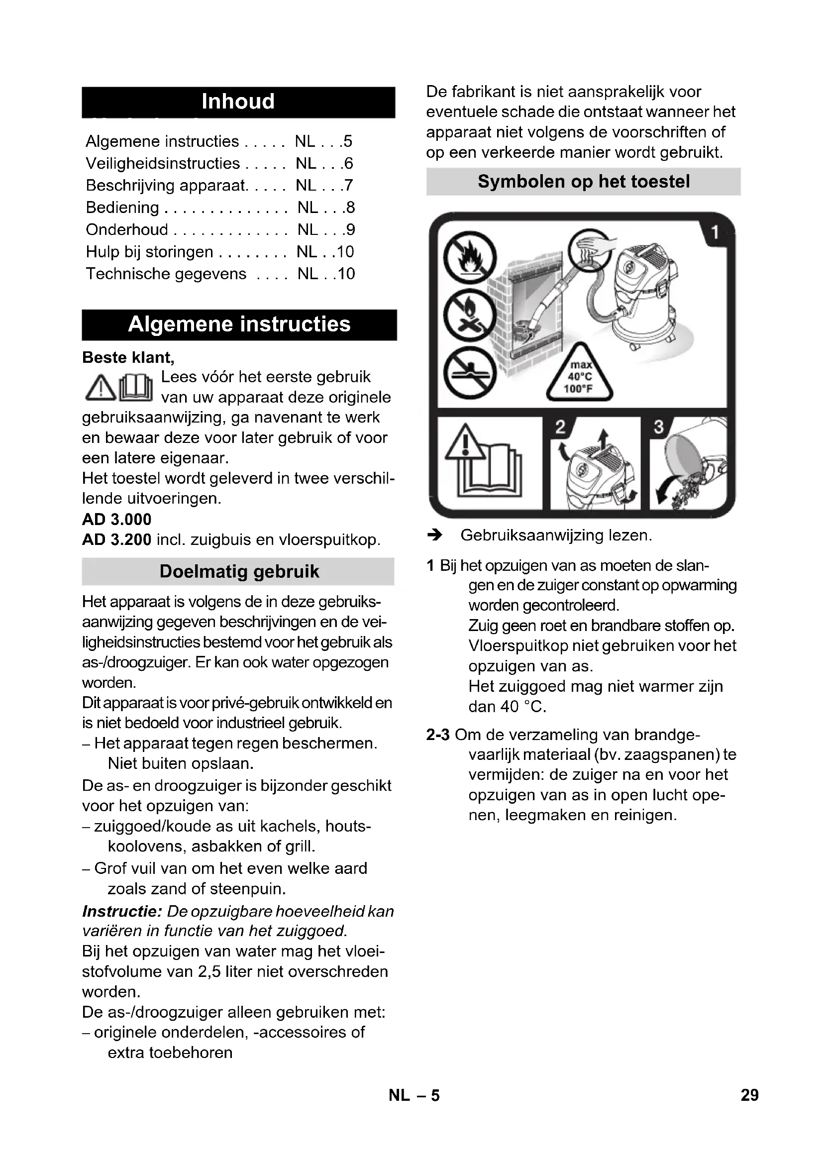 - Potenza P nom 1000 W Potenza P max 1200 W Grado di protezione II Protezione rete (fusibile ritardato) 10 A Capacità vano raccolta 17 l Assorbimento di acqua con impugnatura 2,5 l Assorbimento di acqua con bocchetta per pavi- menti 2,5 l Cavo di alimentazione H05VV-F 2x0,75 Pressione acustica (EN 60704-2-1) 73 dB(A) Peso (senza accessori) 7,4 kg 28 ITNederlands – 5 Beste klant, Lees vóór het eerste gebruik van uw apparaat deze originele gebruiksaanwijzing, ga navenant te werk en bewaar deze voor later gebruik of voor een latere eigenaar. Het toestel wordt geleverd in twee verschil- lende uitvoeringen. AD 3.000 AD 3.200 incl. zuigbuis en vloerspuitkop. Het apparaat is volgens de in deze gebruiks- aanwijzing gegeven beschrijvingen en de vei- ligheidsinstructies bestemd voor het gebruik als as-/droogzuiger. Er kan ook water opgezogen worden. Dit apparaat is voor privé-gebruik ontwikkeld en is niet bedoeld voor industrieel gebruik. – Het apparaat tegen regen beschermen. Niet buiten opslaan. De as- en droogzuiger is bijzonder geschikt voor het opzuigen van: – zuiggoed/koude as uit kachels, houts- koolovens, asbakken of grill. – Grof vuil van om het even welke aard zoals zand of steenpuin. Instructie: De opzuigbare hoeveelheid kan variëren in functie van het zuiggoed. Bij het opzuigen van water mag het vloei- stofvolume van 2,5 liter niet overschreden worden. De as-/droogzuiger alleen gebruiken met: – originele onderdelen, -accessoires of extra toebehoren De fabrikant is niet aansprakelijk voor eventuele schade die ontstaat wanneer het apparaat niet volgens de voorschriften of op een verkeerde manier wordt gebruikt. Gebruiksaanwijzing lezen. Inhoud Algemene instructies