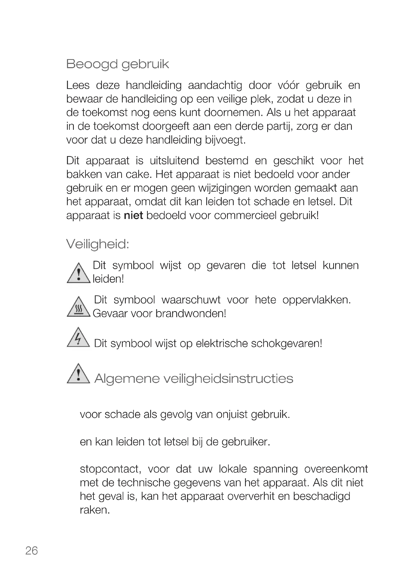 - fordamagescausedbyowner This guarantee does not affect your statutory right, nor any legal right you may have as a costumer under applicable national legislation governing the purchase of goods. Inordertoasserthis/herrightinaguaranteecaseduringthe guaranteed period, the customer must provide evidence of the date of purchase (receipt). The guarantee is to be asserted against KORONA electric GmbH, Sundern/Germany. Service Address: KORONA Service, Am Steinbach 9, 59872 Meschede, Germany Telephone Hotline: 02933 90284-80 Mail: service@korona-electric.de web: www.korona-electric.de within 2 years after the date of purchase. In case of guarantee the customer is given the right to get the appliance repaired at our own or at an authorized shop. Further rights (due to guarantee case) are not given to the customer.26 Beoogd gebruik Lees deze handleiding aandachtig door vóór gebruik en bewaar de handleiding op een veilige plek, zodat u deze in de toekomst nog eens kunt doornemen. Als u het apparaat in de toekomst doorgeeft aan een derde partij, zorg er dan voor dat u deze handleiding bijvoegt. Dit apparaat is uitsluitend bestemd en geschikt voor het bakken van cake. Het apparaat is niet bedoeld voor ander gebruik en er mogen geen wijzigingen worden gemaakt aan het apparaat, omdat dit kan leiden tot schade en letsel. Dit apparaat is niet bedoeld voor commercieel gebruik! Veiligheid: Dit symbool wijst op gevaren die tot letsel kunnen leiden! Dit symbool waarschuwt voor hete oppervlakken. Gevaar voor brandwonden! Dit symbool wijst op elektrische schokgevaren! Algemene veiligheidsinstructies