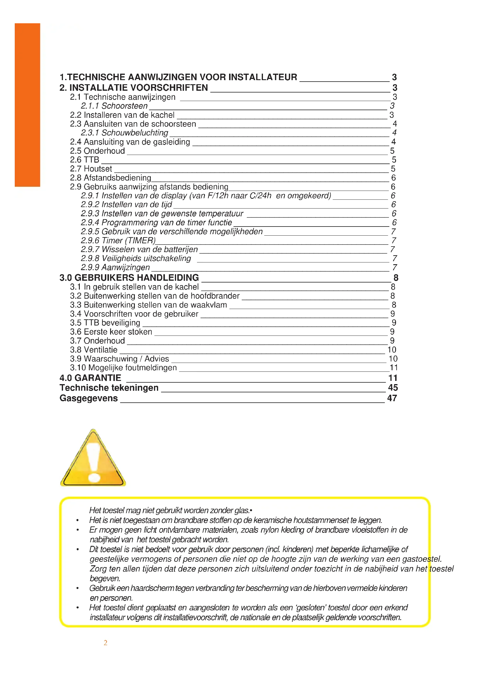 Technische tekeningen _____________________________________________ 45 Gasgegevens _____________________________________________________ 47 Het toestel mag niet gebruikt worden zonder glas.• Het is niet toegestaan om brandbare stoffen op de keramische houtstammenset te leggen.• Er mogen geen licht ontvlambare materialen, zoals nylon kleding of brandbare vloeistoffen in de • nabijheid van het toestel gebracht worden. Dit toestel is niet bedoelt voor gebruik door personen (incl. kinderen) met beperkte lichamelijke of • geestelijke vermogens of personen die niet op de hoogte zijn van de werking van een gastoestel. Zorg ten allen tijden dat deze personen zich uitsluitend onder toezicht in de nabijheid van het toestel begeven. Gebruik een haardscherm tegen verbranding ter bescherming van de hierboven vermelde kinderen • en personen. Het toestel dient geplaatst en aangesloten te worden als een ‘gesloten’ toestel door een erkend • installateur volgens dit installatievoorschrift, de nationale en de plaatselijk geldende voorschriften.3