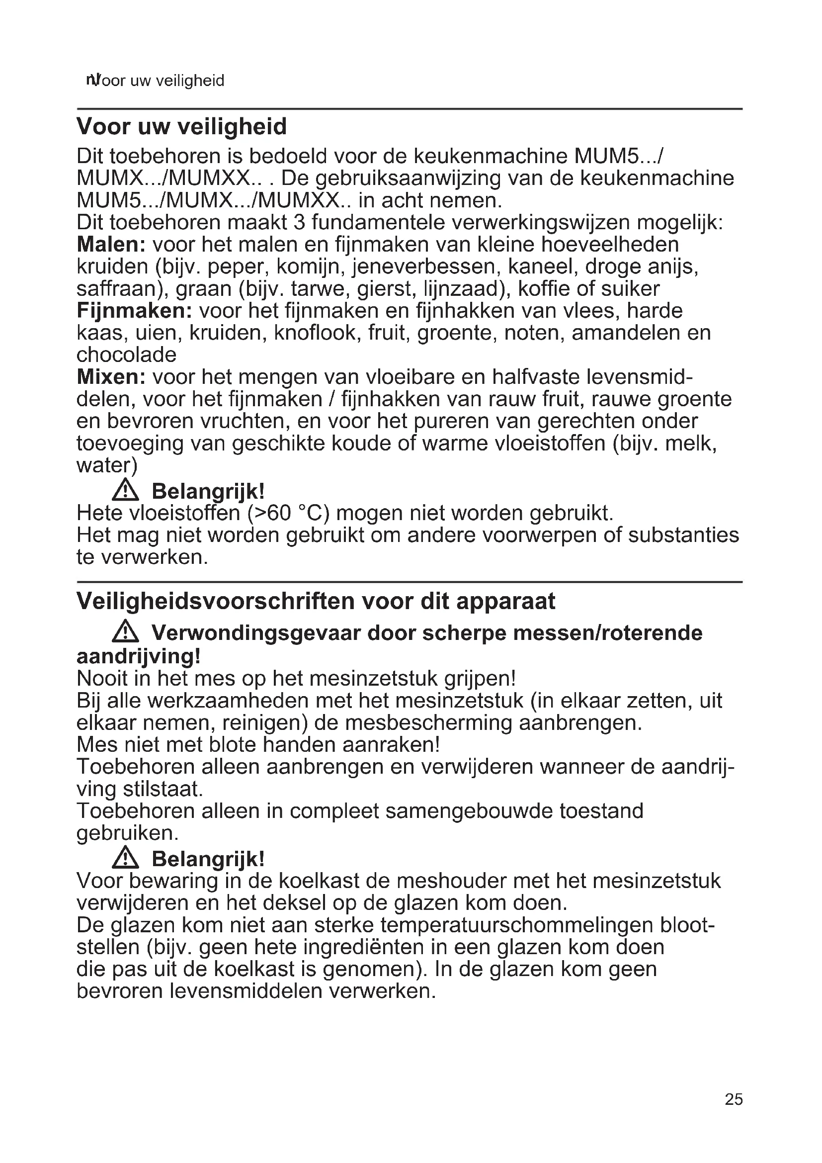 Voor uw veiligheid Voor uw veiligheid Dit toebehoren is bedoeld voor de keukenmachine MUM5.../ MUMX.../MUMXX.. . De gebruiksaanwijzing van de keukenmachine MUM5.../MUMX.../MUMXX.. in acht nemen. Dit toebehoren maakt 3 fundamentele verwerkingswijzen mogelijk: Malen: voor het malen en jnmaken van kleine hoeveelheden kruiden (bijv. peper, komijn, jeneverbessen, kaneel, droge anijs, saffraan), graan (bijv. tarwe, gierst, lijnzaad), kofe of suiker Fijnmaken: voor het jnmaken en jnhakken van vlees, harde kaas, uien, kruiden, knoook, fruit, groente, noten, amandelen en chocolade Mixen: voor het mengen van vloeibare en halfvaste levensmid delen, voor het jnmaken / jnhakken van rauw fruit, rauwe groente en bevroren vruchten, en voor het pureren van gerechten onder toevoeging van geschikte koude of warme vloeistoffen (bijv. melk, water) W Belangrijk! Hete vloeistoffen (>60 °C) mogen niet worden gebruikt. Het mag niet worden gebruikt om andere voorwerpen of substanties te verwerken. Veiligheidsvoorschriften voor dit apparaat W Verwondingsgevaar door scherpe messen/roterende aandrijving! Nooit in het mes op het mesinzetstuk grijpen! Bij alle werkzaamheden met het mesinzetstuk (in elkaar zetten, uit elkaar nemen, reinigen) de mesbescherming aanbrengen. Mes niet met blote handen aanraken! Toebehoren alleen aanbrengen en verwijderen wanneer de aandrij ving stilstaat. Toebehoren alleen in compleet samengebouwde toestand gebruiken. W Belangrijk! Voor bewaring in de koelkast de meshouder met het mesinzetstuk verwijderen en het deksel op de glazen kom doen. De glazen kom niet aan sterke temperatuurschommelingen bloot stellen (bijv. geen hete ingrediënten in een glazen kom doen die pas uit de koelkast is genomen). In de glazen kom geen bevroren levensmiddelen verwerken.26 nl Veiligheidsvoorschriften voor dit apparaat Lees voor de ingebruikneming zorg- vuldig deze gebruiksaanwijzing, die belangrijke veiligheids- en bedienings- aanwijzingen over het apparaat bevat. De gebruiksaanwijzing bewaren a.u.b. Overhandig ook de gebruiksaanwijzing als u het apparaat doorgeeft aan derden. De gebruiksaanwijzing beschrijft verschil lende toebehorenuitrustingen en hun gebruik op verschillende apparaten. In één oogopslag De pagina‘s met afbeeldingen uitklappen a.u.b. Afb. A 1 Mesbescherming 2 Mesinzetstuk met maalmes (zwarte afdichting, metalen bodem) 3 Mesinzetstuk met mixer-/jnmaakmes (rode afdichting, kunststof bodem) 4 Meshouder Maal-/jnmaak-opzetstuk 5 Deksel
