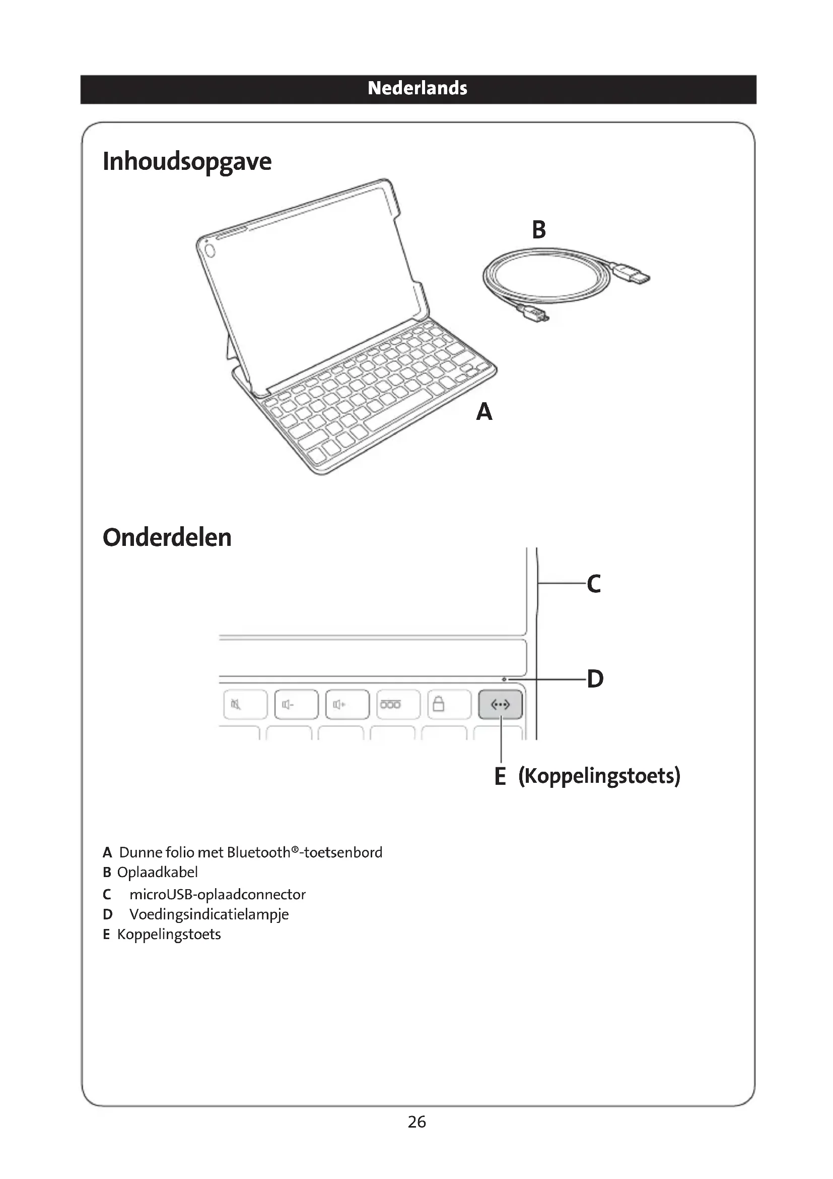 - Het KeyFolio bevat een lithium-/polymeerbatterij die ontvlambaar is. Houd dit uit de nabijheid van open vuur.