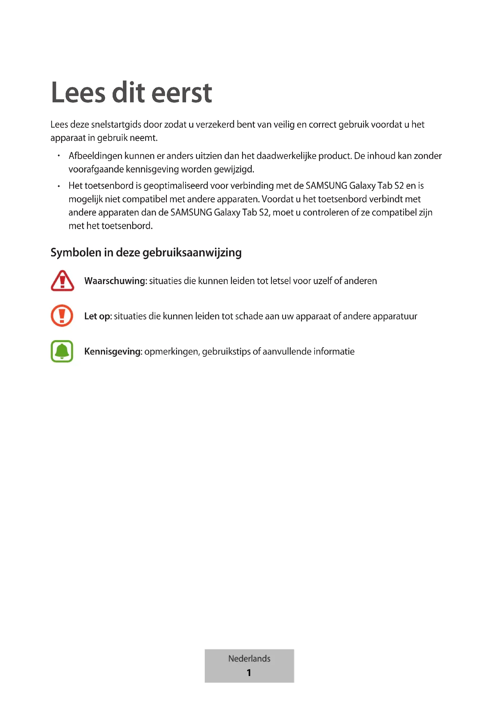 Het toetsenbord is geoptimaliseerd voor verbinding met de SAMSUNG Galaxy Tab S2 en is mogelijk niet compatibel met andere apparaten. Voordat u het toetsenbord verbindt met andere apparaten dan de SAMSUNG Galaxy Tab S2, moet u controleren of ze compatibel zijn met het toetsenbord. Symbolen in deze gebruiksaanwijzing Waarschuwing: situaties die kunnen leiden tot letsel voor uzelf of anderen Let op: situaties die kunnen leiden tot schade aan uw apparaat of andere apparatuur Kennisgeving: opmerkingen, gebruikstips of aanvullende informatie Nederlands