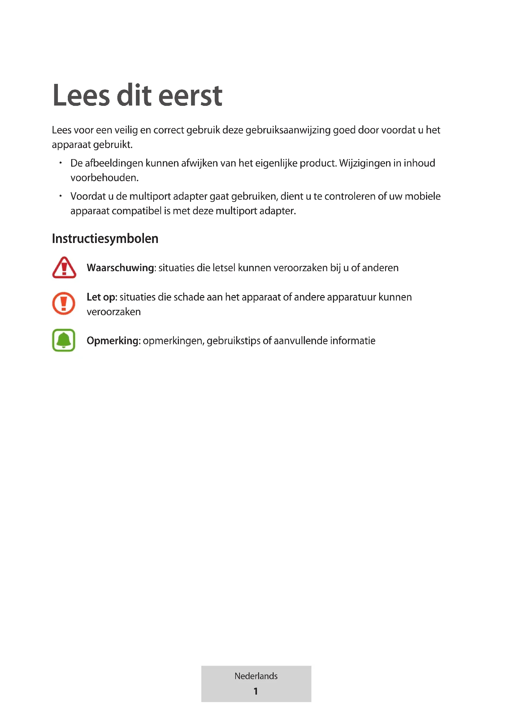 Voordat u de multiport adapter gaat gebruiken, dient u te controleren of uw mobiele apparaat compatibel is met deze multiport adapter. Instructiesymbolen Waarschuwing: situaties die letsel kunnen veroorzaken bij u of anderen Let op: situaties die schade aan het apparaat of andere apparatuur kunnen veroorzaken Opmerking: opmerkingen, gebruikstips of aanvullende informatie Nederlands2 Nederlands Aan de slag Inhoud van de verpakking Controleer of de doos de volgende onderdelen bevat: