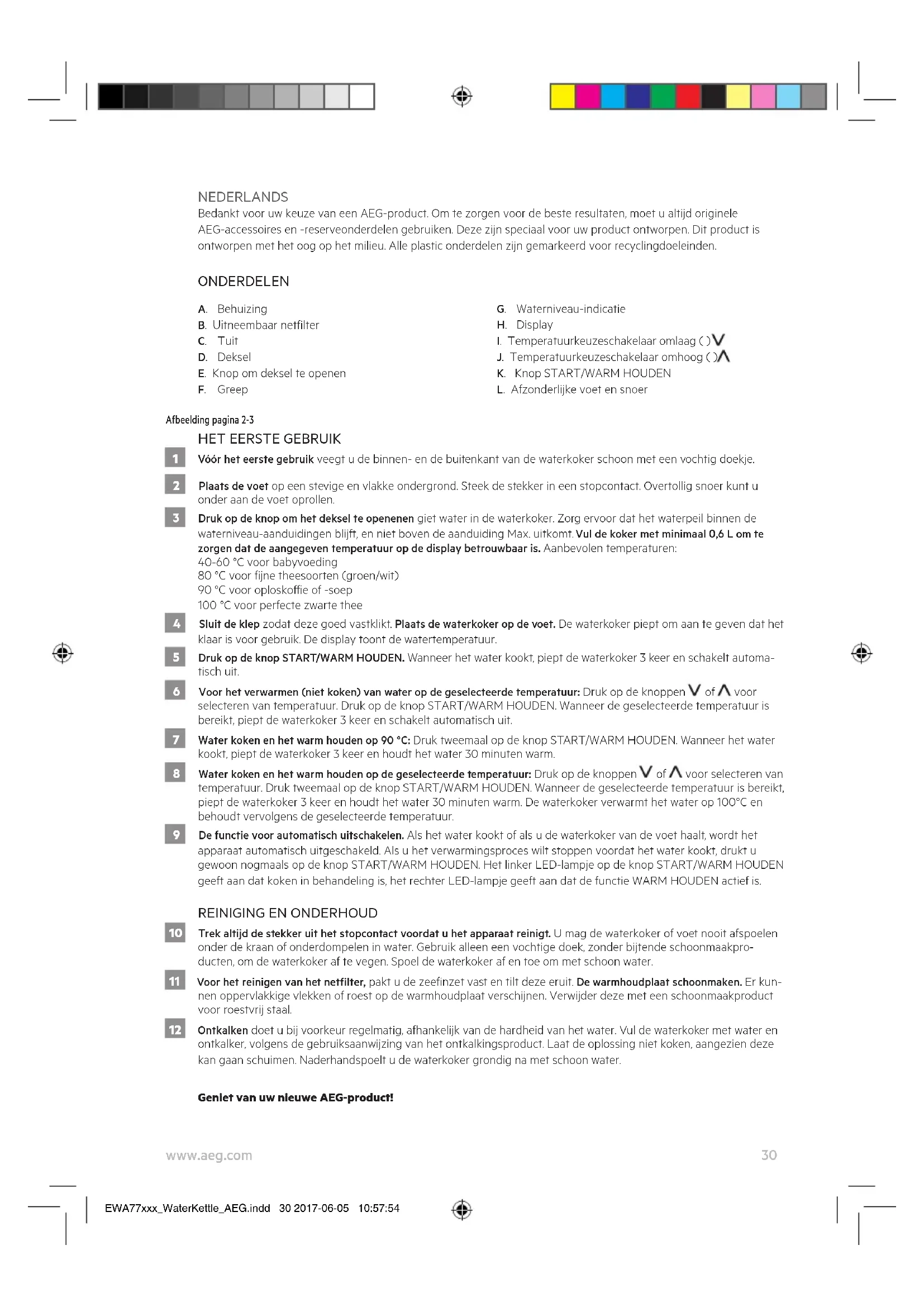 - U mag de waterkoker alleen gebruiken met de bijbehorende voet. EWA77xxx_WaterKettle_AEG.indd 31 2017-06-05 10:57:5432 www.aeg.com