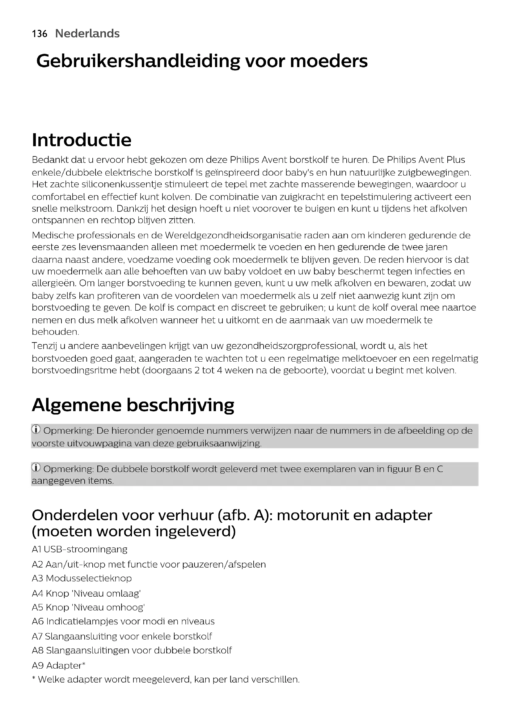 Nederlands Gebruikershandleiding voor moeders Introductie Bedankt dat u ervoor hebt gekozen om deze Philips Avent borstkolf te huren. De Philips Avent Plus enkele/dubbele elektrische borstkolf is geïnspireerd door baby's en hun natuurlijke zuigbewegingen. Het zachte siliconenkussentje stimuleert de tepel met zachte masserende bewegingen, waardoor u comfortabel en effectief kunt kolven. De combinatie van zuigkracht en tepelstimulering activeert een snelle melkstroom. Dankzij het design hoeft u niet voorover te buigen en kunt u tijdens het afkolven ontspannen en rechtop blijven zitten. Medische professionals en de Wereldgezondheidsorganisatie raden aan om kinderen gedurende de eerste zes levensmaanden alleen met moedermelk te voeden en hen gedurende de twee jaren daarna naast andere, voedzame voeding ook moedermelk te blijven geven. De reden hiervoor is dat uw moedermelk aan alle behoeften van uw baby voldoet en uw baby beschermt tegen infecties en allergieën. Om langer borstvoeding te kunnen geven, kunt u uw melk afkolven en bewaren, zodat uw baby zelfs kan profiteren van de voordelen van moedermelk als u zelf niet aanwezig kunt zijn om borstvoeding te geven. De kolf is compact en discreet te gebruiken; u kunt de kolf overal mee naartoe nemen en dus melk afkolven wanneer het u uitkomt en de aanmaak van uw moedermelk te behouden. Tenzij u andere aanbevelingen krijgt van uw gezondheidszorgprofessional, wordt u, als het borstvoeden goed gaat, aangeraden te wachten tot u een regelmatige melktoevoer en een regelmatig borstvoedingsritme hebt (doorgaans 2 tot 4 weken na de geboorte), voordat u begint met kolven. Algemene beschrijving Opmerking: De hieronder genoemde nummers verwijzen naar de nummers in de afbeelding op de voorste uitvouwpagina van deze gebruiksaanwijzing. Opmerking: De dubbele borstkolf wordt geleverd met twee exemplaren van in figuur B en C aangegeven items. Onderdelen voor verhuur (afb. A): motorunit en adapter (moeten worden ingeleverd) A1 USB-stroomingang A2 Aan/uit-knop met functie voor pauzeren/afspelen A3 Modusselectieknop A4 Knop 'Niveau omlaag' A5 Knop 'Niveau omhoog' A6 Indicatielampjes voor modi en niveaus A7 Slangaansluiting voor enkele borstkolf A8 Slangaansluitingen voor dubbele borstkolf A9 Adapter*