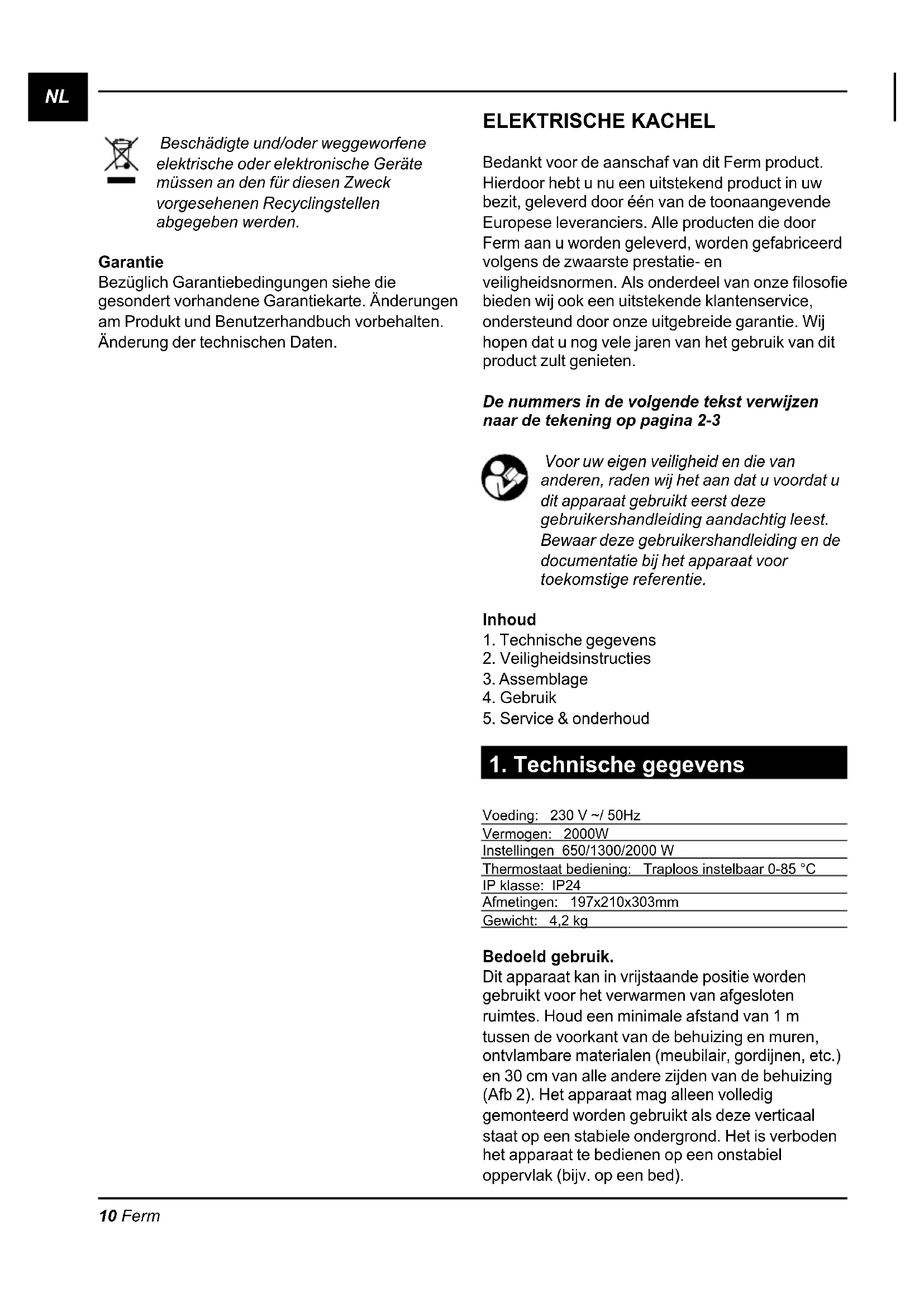 Het apparaat mag alleen voor het voorgeschreven doel worden gebruikt. Elk ander gebruik wordt gezien als een geval van misbruik. De gebruiker, en niet de fabrikant, wordt aansprakelijk gehouden voor elke schade en elke vorm van letsel dat voortkomt uit het misbruik van dit apparaat Het apparaat is uitstekend geschikt voor grotere ruimtes. Omdat een groot volume lucht wordt verwarmd en verspreid, kan de lucht koeler aanvoelen dan de lucht van een conventionele straalkachel. Dit is geen tekortkoming van het apparaat. Het voordeel is dat de volledige ruimte wordt verwarmd in plaats van alleen het gebied rond de kachel.