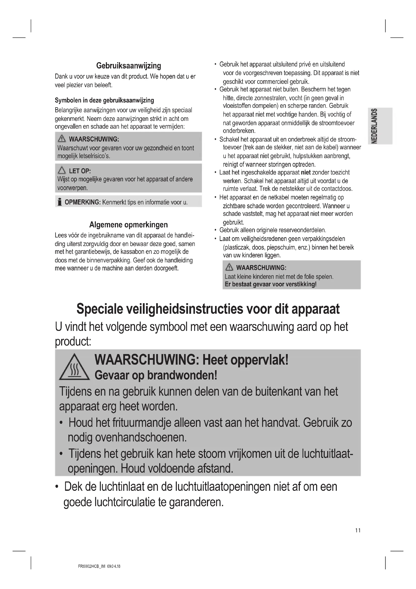 - Bewaar het apparaat op een goed geventileerde en droge plaats buiten het bereik van kinderen. Verhelpen van storingen Als er een probleem optreedt is dit vaak niets ernstigs. Voor u contact opneemt met onze servicedienst, vragen wij u de onderstaande informatie door te lezen: Probleem Mogelijke oorzaak Maatregel Het apparaat functi- oneert niet. Het apparaat ontvangt geen voeding. Controleer het stopcontact met een ander apparaat. Steek de stekker correct in het stopcontact. Controleer de hoofdcircuitbreker. U hebt de bereidingstijd niet ingesteld. Stel de gewenste bereidingstijd in. Het voedsel is niet overal geheel gaar. Het frituurmandje zit te vol. Verminder de hoeveelheid voedsel. Kleinere hoe- veelheden worden gelijkmatiger gaar. De temperatuur is te laag ingesteld. Zet de temperatuur hoger met de temperatuurrege- laar (zie de “Tabel met bereidingstijden”). De bereidingstijd is te kort ingesteld. Gebruik de timer om de tijd te verhogen (zie de “Tabel met bereidingstijden”). Niet alle voedsel is ongelijkmatig gaar. Als het voedsel bovenop elkaar ligt is er onvol- doende luchtcirculatie. Schud het voedsel halverwege de bereidingstijd. Het voedsel is niet knapperig. Er is voedsel gebruikt dat alleen geschikt is voor een conventionele friteuse. Gebruik oven-voedsel of besprenkel het met wat olie. Er komt rook uit het apparaat. U bent erg vet voedsel aan het bereiden. Vetspetters in het apparaat kan de uitstoot van rook veroorzaken. Zorg voor een goede ventilatie. In het frituurmandje zit nog vet van de vorige bereiding. Reinig het frituurmandje na elk gebruik zoals be- schreven in het hoofdstuk “Reiniging”.FR6002HCB_IM 09.0 4.18