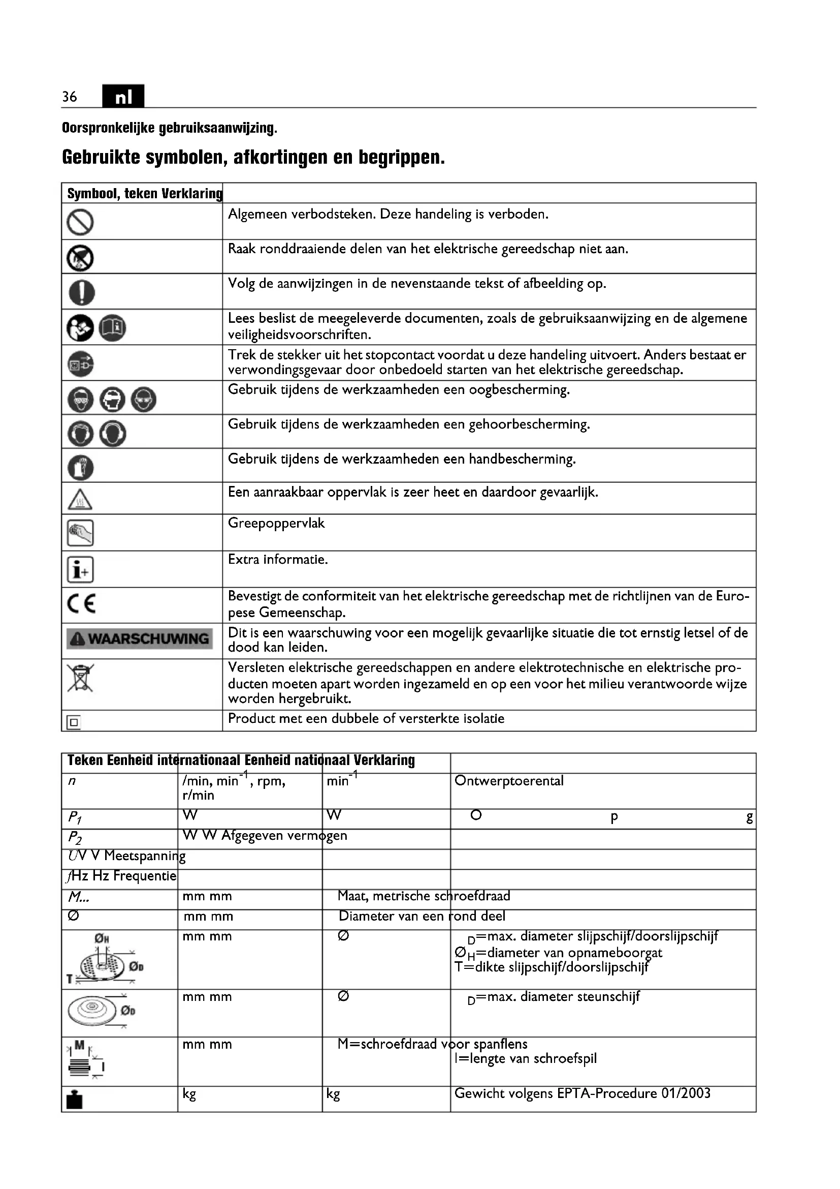 Oorspronkelijke gebruiksaanwijzing. Gebruikte symbolen, afkortingen en begrippen. Symbool, teken Verklaring Algemeen verbodsteken. Deze handeling is verboden. Raak ronddraaiende delen van het elektrische gereedschap niet aan. Volg de aanwijzingen in de nevenstaande tekst of afbeelding op. Lees beslist de meegeleverde documenten, zoals de gebruiksaanwijzing en de algemene veiligheidsvoorschriften. Trek de stekker uit het stopcontact voordat u deze handeling uitvoert. Anders bestaat er verwondingsgevaar door onbedoeld starten van het elektrische gereedschap. Gebruik tijdens de werkzaamheden een oogbescherming. Gebruik tijdens de werkzaamheden een gehoorbescherming. Gebruik tijdens de werkzaamheden een handbescherming. Een aanraakbaar oppervlak is zeer heet en daardoor gevaarlijk. Greepoppervlak Extra informatie. Bevestigt de conformiteit van het elektrische gereedschap met de richtlijnen van de Euro- pese Gemeenschap. Dit is een waarschuwing voor een mogelijk gevaarlijke situatie die tot ernstig letsel of de dood kan leiden. Versleten elektrische gereedschappen en andere elektrotechnische en elektrische pro- ducten moeten apart worden ingezameld en op een voor het milieu verantwoorde wijze worden hergebruikt. Product met een dubbele of versterkte isolatie Teken Eenheid internationaal Eenheid nationaal Verklaring