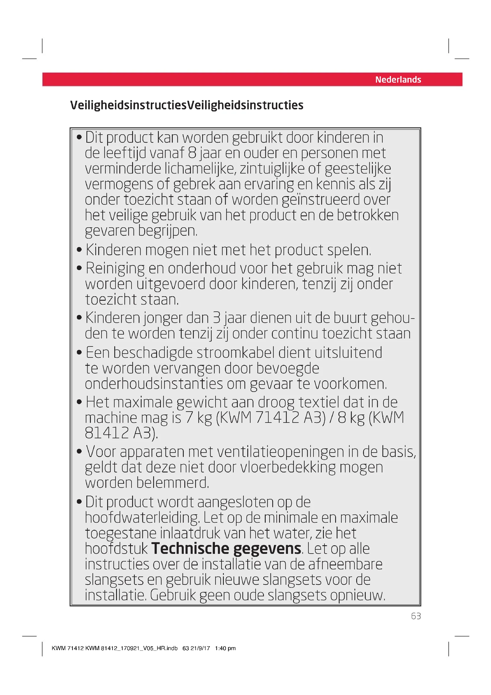 De maximale centrifugesnelheid voor het standaard katoenprogramma op 60 °C bij volledige lading of het standaard katoenprogramma op 40 °C bij gedeeltelijke lading, indien deze lager is, en het resterend vochtgehalte voor het standaard katoenprogramma op 60 °C bij volledige lading of het standaard katoenprogramma op 40 °C bij gedeeltelijke lading, indien dit hoger is 1400 rpm KWM 71412 KWM 81412_170921_V05_HR.indb 85 21/9/17 1:40 pm86 Nederlands Size - A5 Typeaanduiding KWM 71412 A3 KWM 81412 A3