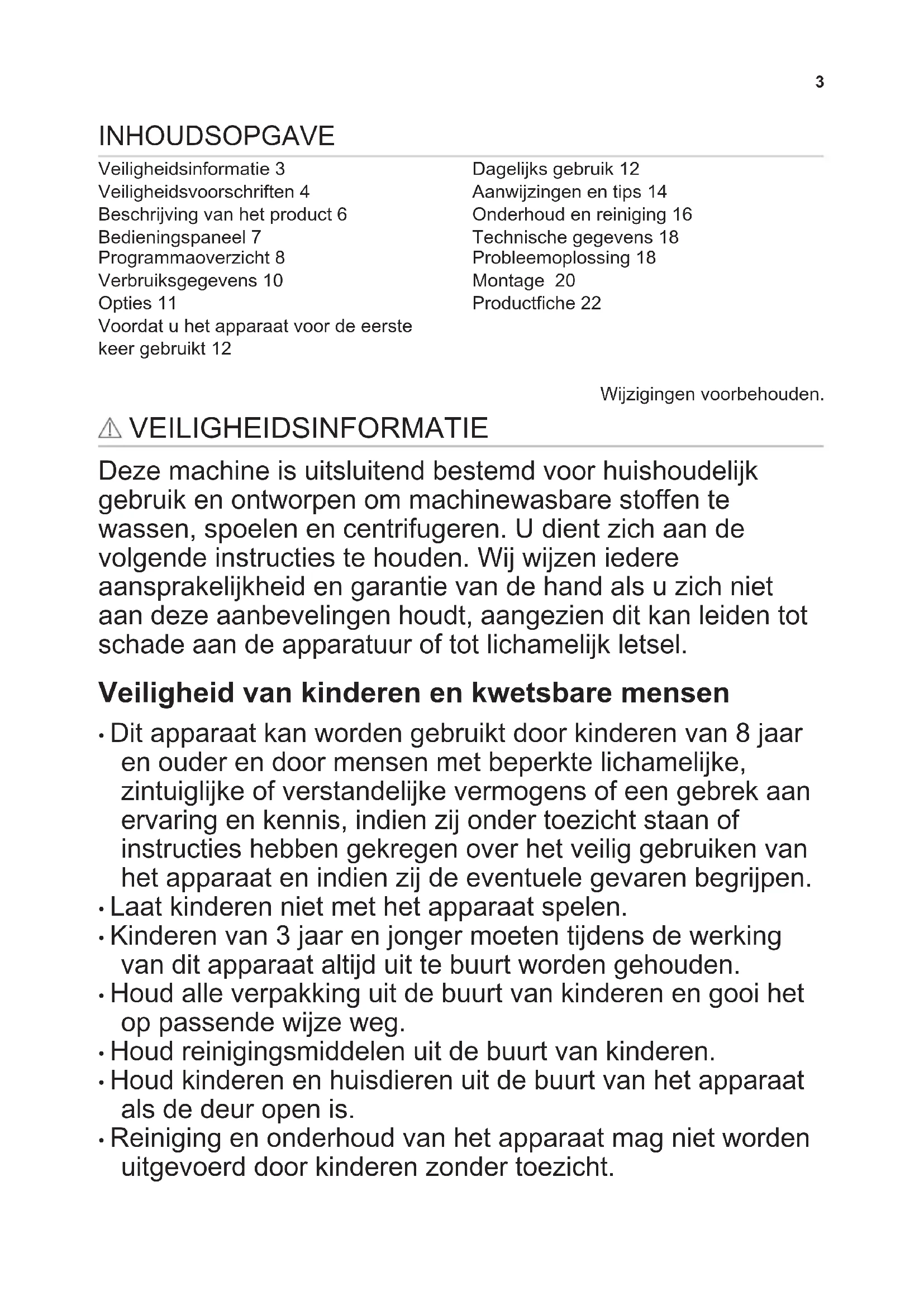 Veiligheidsinformatie 3 Veiligheidsvoorschriften 4 Beschrijving van het product 6 Bedieningspaneel 7 Programmaoverzicht 8 Verbruiksgegevens 10 Opties 11 Voordat u het apparaat voor de eerste keer gebruikt 12 Dagelijks gebruik 12 Aanwijzingen en tips 14 Onderhoud en reiniging 16 Technische gegevens 18 Probleemoplossing 18 Montage 20 Productfiche 22 Wijzigingen voorbehouden. VEILIGHEIDSINFORMATIE Deze machine is uitsluitend bestemd voor huishoudelijk gebruik en ontworpen om machinewasbare stoffen te wassen, spoelen en centrifugeren. U dient zich aan de volgende instructies te houden. Wij wijzen iedere aansprakelijkheid en garantie van de hand als u zich niet aan deze aanbevelingen houdt, aangezien dit kan leiden tot schade aan de apparatuur of tot lichamelijk letsel. Veiligheid van kinderen en kwetsbare mensen