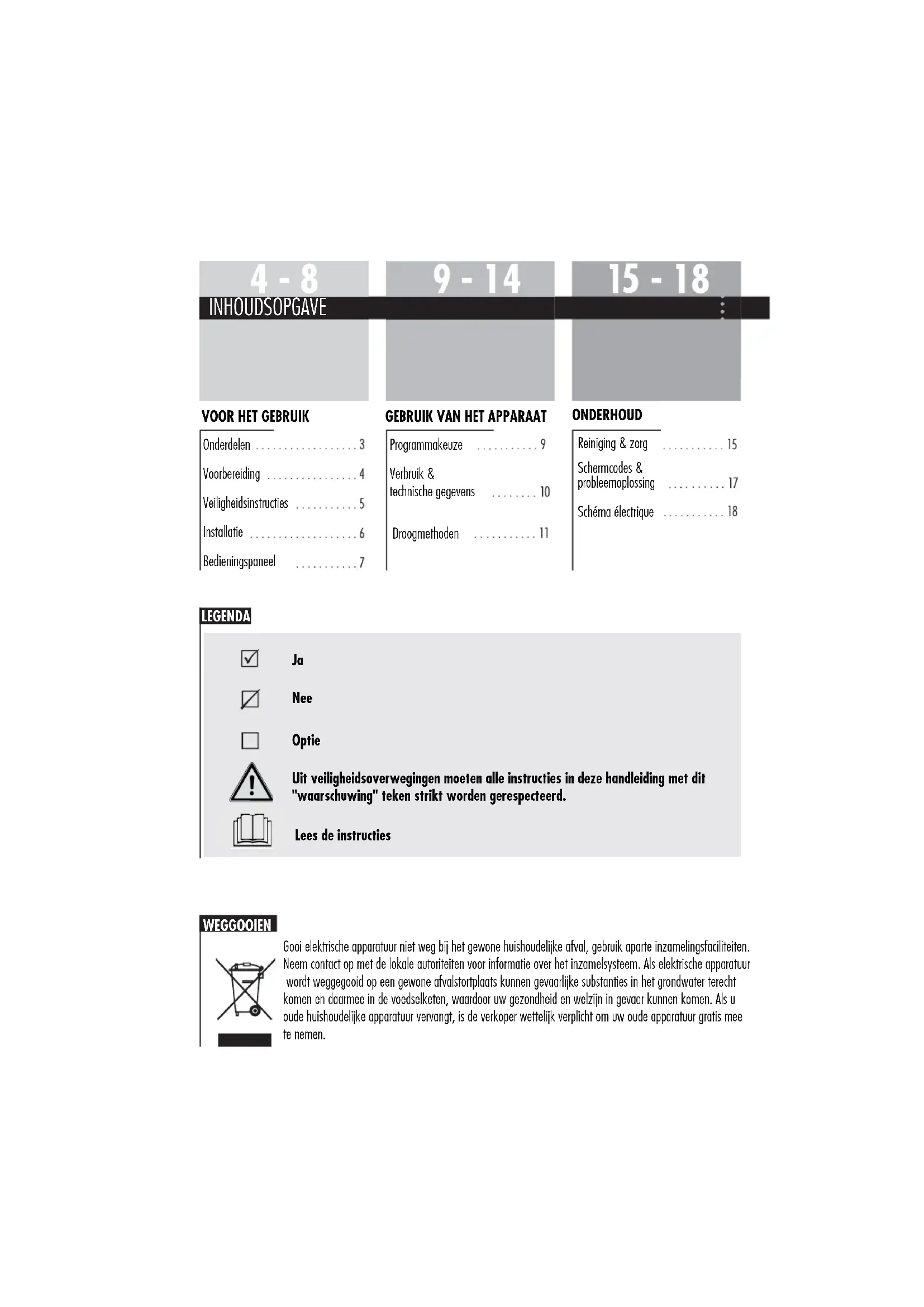 ONDERHOUD Onderdelen Voorbereiding Veiligheidsinstructies Installatie Bedieningspaneel Gooi elektrische apparatuur niet weg bij het gewone huishoudelijke afval, gebruik aparte inzamelingsfaciliteiten. Neem contact op met de lokale autoriteiten voor informatie over het inzamelsysteem. Als elektrische apparatuur wordt weggegooid op een gewone afvalstortplaats kunnen gevaarlijke substanties in het grondwater terecht komen en daarmee in de voedselketen, waardoor uw gezondheid en welzijn in gevaar kunnen komen. Als u oude huishoudelijke apparatuur vervangt, is de verkoper wettelijk verplicht om uw oude apparatuur gratis mee te nemen. Reiniging & zorg Verbruik & technische gegevens Programmakeuze Droogmethoden