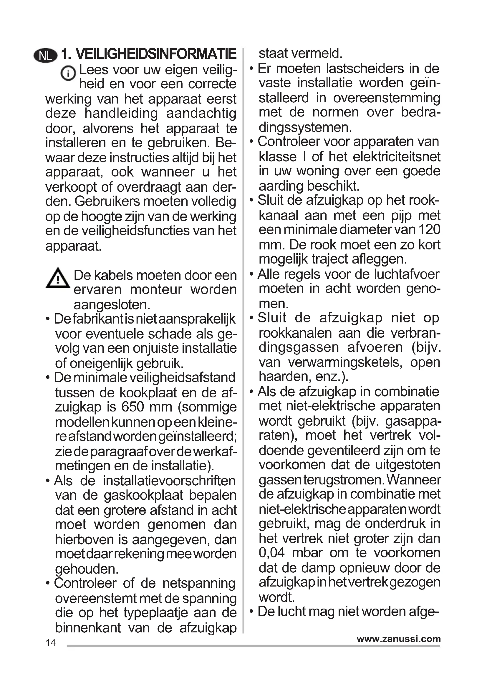 - De lucht mag niet worden afge- NL15 www.zanussi.com voerd door een kanaal dat wordt gebruikt voor de rookgasafvoer door apparaten op gas of andere brandstoffen.