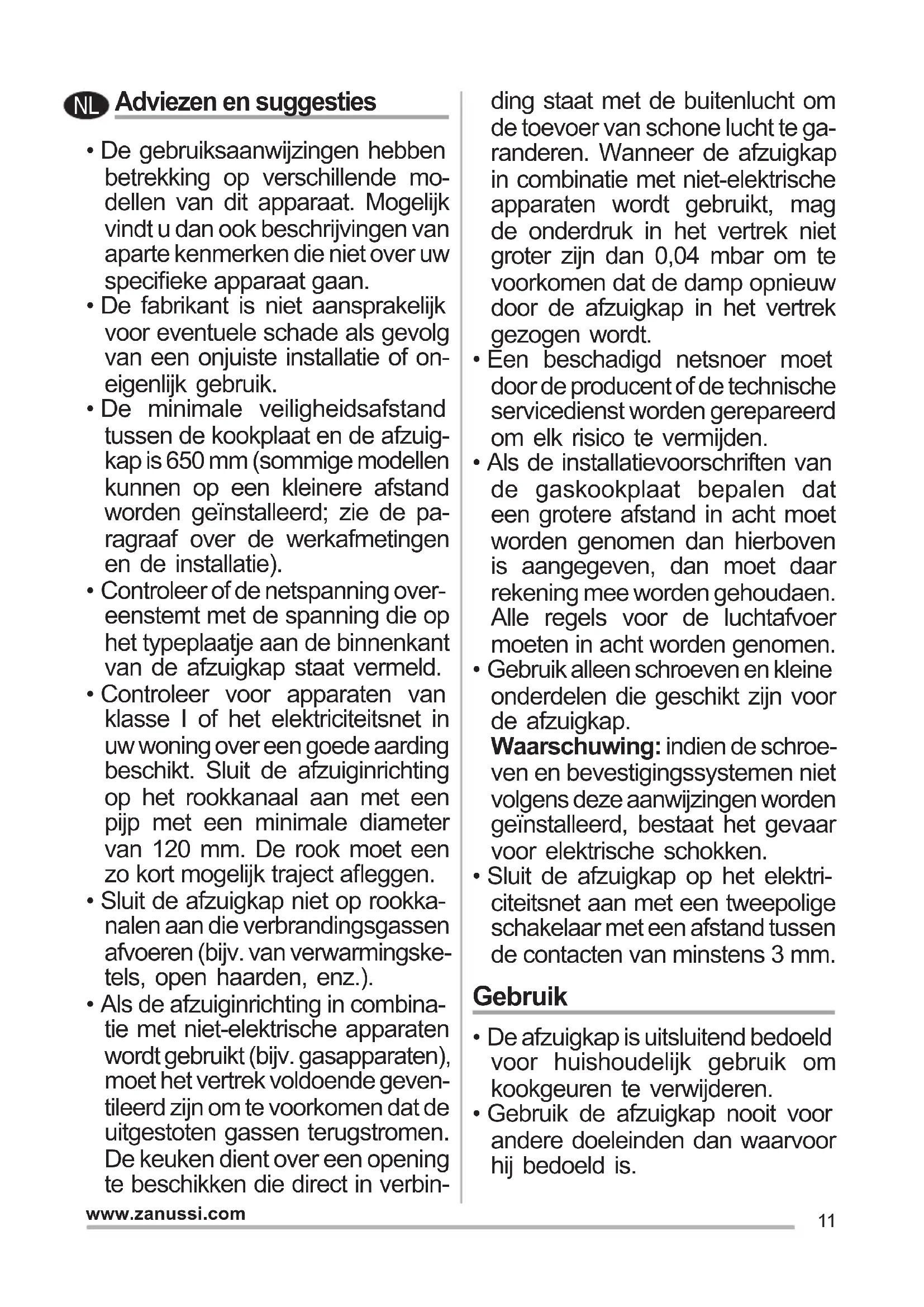 - Gebruik de afzuigkap nooit voor andere doeleinden dan waarvoor hij bedoeld is. NL12 www.zanussi.com