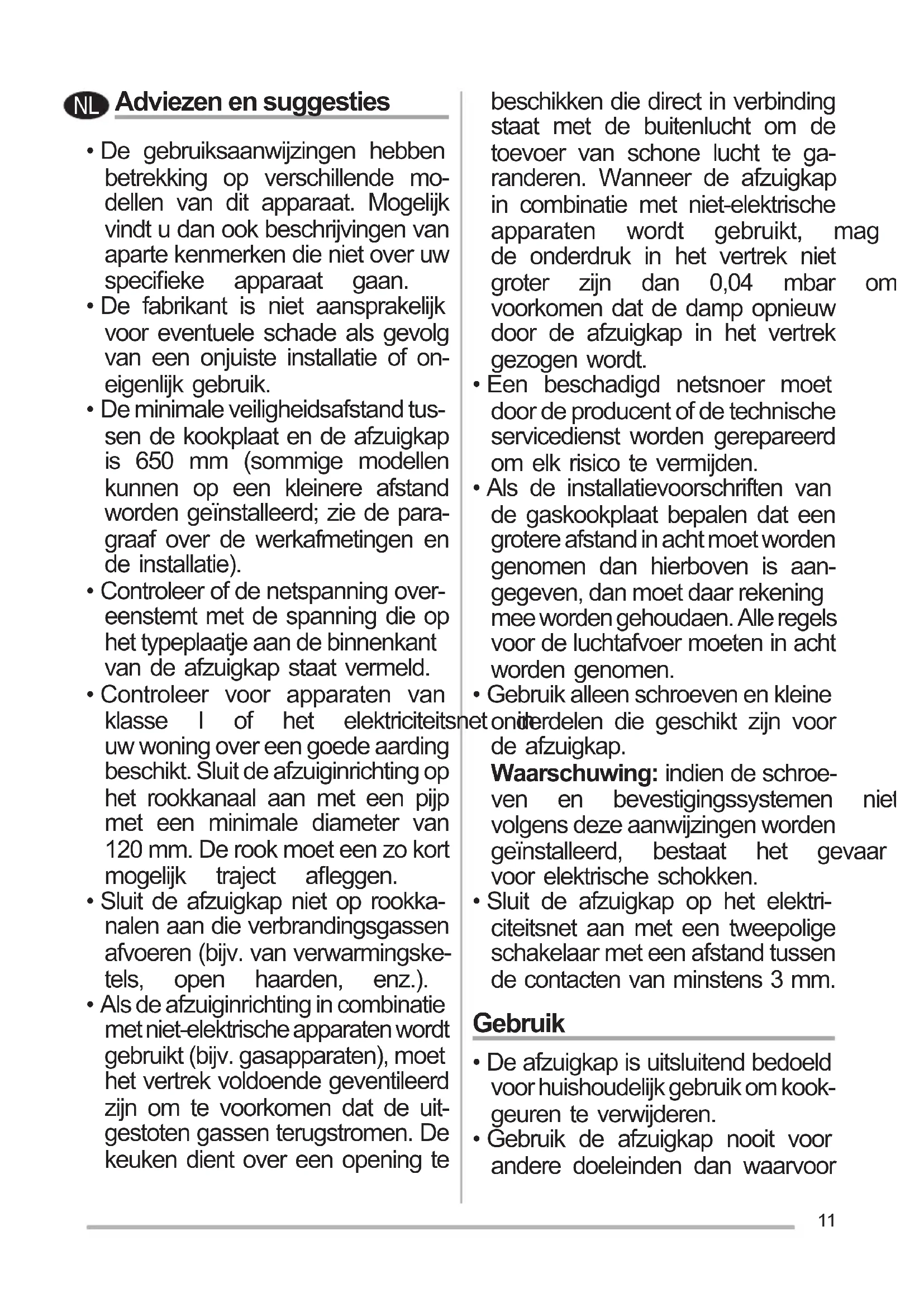 - Gebruik de afzuigkap nooit voor andere doeleinden dan waarvoor NL12 hij bedoeld is.
