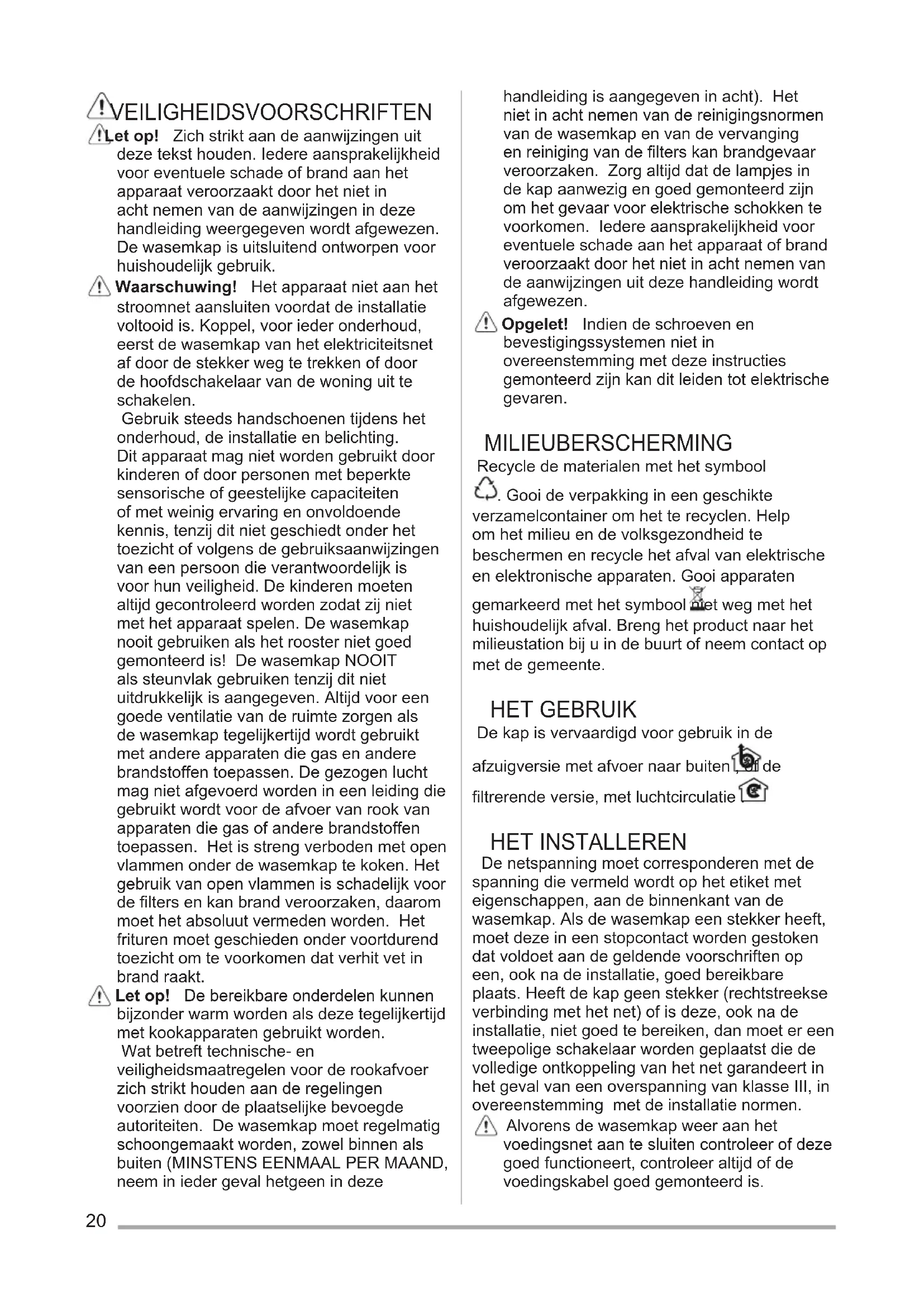 1 Bouton ON/OFF lumière 2 Bouton ON/OFF Timer: délai d’arrêt de la vitesse (puissance) d’aspiration sélectionné: Vitesse (puissance) d’aspiration 1: 20 minutes Vitesse (puissance) d’aspiration 2: 15 minutes Vitesse (puissance) d’aspiration 3: 10 minutes Vitesse (puissance) d’aspiration intensive: 5 minutes 3 Bouton OFF / Diminution vitesse (puissance) d’aspiration 4 Bouton ON / Augmentation vitesse (puissance) d’aspiration 5 Affichage, indique: a. Vitesse (puissance) d’aspiration: LED L1 – L2 – L3 - L4 (clignotants) s’allument selon la vitesse d’aspiration (puissance) sélectionnée . Note: LED L4 – vitesse (puissance) d’aspiration intensive fonctionne pendant environ 5 minutes, puis la hotte se met à la vitesse intermédiaire. b. Timer: a LED de la vitesse sélectionnée clignote pour indiquer que le temporisateur est actif. c. Saturation filtre à graisse: les LED L3 et L4 clignotent alternativement à de courts intervalles de temps. d. Saturation du filtre à charbon actif: les LED L3 et L4 clignotent simultanément à de courts intervalles de temps. Remise à zéro de l’indicateur de saturation du filtre: effectuer la maintenance du filtre, puis appuyez sur le bouton 2 jusqu’à ce que les LED s’éteignent. Note: la saturation du filtre à charbon actif est normalement désactivée et est activée uniquement si la hotte est utilisée dans la version de recyclage (avec filtre à charbon installé). Pour activer la saturation, procédez comme suit: - Arrêter la hotte - Maintenez appuyé simultanément les boutons 3 et 4, jusqu’à ce que les LED L1 et L2 clignotent brièvement. Pour désactiver répétez l’opération, seulement LED L1 clignote brièvement. ÉCLAIRAGE La hotte est dotée d’un système d’éclairage basé sur la technologie LED. Les LEDS garantissent un éclairage optimal, une durée jusqu’à 10 fois supérieures aux ampoules traditionnelles et permettent une épargne de 90% en énergie électrique. Attention! Ne regardez pas directement la lumière provenant des LED. Pour remplacer les lampes, contactez le centre service agréé pour pièces de rechange.20 VEILIGHEIDSVOORSCHRIFTEN Let op! Zich strikt aan de aanwijzingen uit deze tekst houden. Iedere aansprakelijkheid voor eventuele schade of brand aan het apparaat veroorzaakt door het niet in acht nemen van de aanwijzingen in deze handleiding weergegeven wordt afgewezen. De wasemkap is uitsluitend ontworpen voor huishoudelijk gebruik. Waarschuwing! Het apparaat niet aan het stroomnet aansluiten voordat de installatie voltooid is. Koppel, voor ieder onderhoud, eerst de wasemkap van het elektriciteitsnet af door de stekker weg te trekken of door de hoofdschakelaar van de woning uit te schakelen. Gebruik steeds handschoenen tijdens het onderhoud, de installatie en belichting. Dit apparaat mag niet worden gebruikt door kinderen of door personen met beperkte sensorische of geestelijke capaciteiten of met weinig ervaring en onvoldoende kennis, tenzij dit niet geschiedt onder het toezicht of volgens de gebruiksaanwijzingen van een persoon die verantwoordelijk is voor hun veiligheid. De kinderen moeten altijd gecontroleerd worden zodat zij niet met het apparaat spelen. De wasemkap nooit gebruiken als het rooster niet goed gemonteerd is! De wasemkap NOOIT als steunvlak gebruiken tenzij dit niet uitdrukkelijk is aangegeven. Altijd voor een goede ventilatie van de ruimte zorgen als de wasemkap tegelijkertijd wordt gebruikt met andere apparaten die gas en andere brandstoffen toepassen. De gezogen lucht mag niet afgevoerd worden in een leiding die gebruikt wordt voor de afvoer van rook van apparaten die gas of andere brandstoffen toepassen. Het is streng verboden met open vlammen onder de wasemkap te koken. Het gebruik van open vlammen is schadelijk voor de filters en kan brand veroorzaken, daarom moet het absoluut vermeden worden. Het frituren moet geschieden onder voortdurend toezicht om te voorkomen dat verhit vet in brand raakt. Let op! De bereikbare onderdelen kunnen bijzonder warm worden als deze tegelijkertijd met kookapparaten gebruikt worden. Wat betreft technische- en veiligheidsmaatregelen voor de rookafvoer zich strikt houden aan de regelingen voorzien door de plaatselijke bevoegde autoriteiten. De wasemkap moet regelmatig schoongemaakt worden, zowel binnen als buiten (MINSTENS EENMAAL PER MAAND, neem in ieder geval hetgeen in deze handleiding is aangegeven in acht). Het niet in acht nemen van de reinigingsnormen van de wasemkap en van de vervanging en reiniging van de filters kan brandgevaar veroorzaken. Zorg altijd dat de lampjes in de kap aanwezig en goed gemonteerd zijn om het gevaar voor elektrische schokken te voorkomen. Iedere aansprakelijkheid voor eventuele schade aan het apparaat of brand veroorzaakt door het niet in acht nemen van de aanwijzingen uit deze handleiding wordt afgewezen. Opgelet! Indien de schroeven en bevestigingssystemen niet in overeenstemming met deze instructies gemonteerd zijn kan dit leiden tot elektrische gevaren. MILIEUBERSCHERMING Recycle de materialen met het symbool . Gooi de verpakking in een geschikte verzamelcontainer om het te recyclen. Help om het milieu en de volksgezondheid te beschermen en recycle het afval van elektrische en elektronische apparaten. Gooi apparaten gemarkeerd met het symbool niet weg met het huishoudelijk afval. Breng het product naar het milieustation bij u in de buurt of neem contact op met de gemeente. HET GEBRUIK De kap is vervaardigd voor gebruik in de afzuigversie met afvoer naar buiten , of de filtrerende versie, met luchtcirculatie . HET INSTALLEREN De netspanning moet corresponderen met de spanning die vermeld wordt op het etiket met eigenschappen, aan de binnenkant van de wasemkap. Als de wasemkap een stekker heeft, moet deze in een stopcontact worden gestoken dat voldoet aan de geldende voorschriften op een, ook na de installatie, goed bereikbare plaats. Heeft de kap geen stekker (rechtstreekse verbin